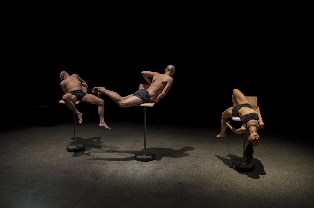 C’est surtout vrai dans Candles où Mathias Dou, Paola Cordova et Aurélie Varrin sont perchées sur trois tabourets de bar surélevés qui n’offrent qu’instabilité et inconfort en place de la promesse de détente liée à ce type de siège. Le bar aussi est absent. Et les corps tremblent, au son d’avions, de voitures et autres fétiches de la mobilité urbaine. Ils se plient et finissent par chuter, alors qu’ils rêvaient d’envol. Après quoi il faut bien recommencer ce tour de force dantesque. On pourrait y voir trois Sisyphe. Sauf qu’ils n’ont même pas une pierre à rouler. Trois bougies humines, en prises avec la vanité. Que cherchent-ils en luttant contre leur inévitable extinction ?