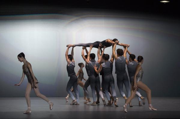 Décor graphique, costumes miroitants pour les filles, gris dégradé pour les garçons, éclairages somptueux qui altternent avec brio ombres et lumières léchées, l’ensemble a un côté chic et sobre, un peu high-tech, sans aspérité, tout comme la musique de Nico Mulhy. La chorégraphie s’inscrit clairement dans le pas des aînés déjà cités, plus une petite touche Forsythe pour les danseurs assis sur des bancs de part et d’autre de la scène quand ils ne dansent pas.