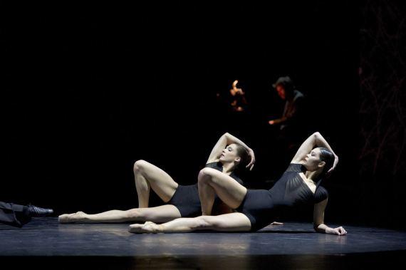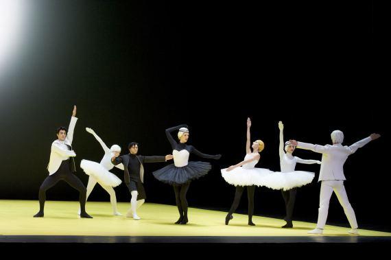 Enfin, Edouard Lock dans AndréAuria nous fait plonger dans l’aspect le plus virtuose de la danse classique revisitée années 90. Plus vite. Plus fort. Plus risqué. Sur la musique pour deux pianos de David Lang, la danse apparaît à chaque fois comme une déflagration. D’une complexité et d’une rapidité inouïe, la chorégraphie semble dissocier – on serait même tenté d’écrire disséquer – les corps dansant. Les croisements et rotations des jambes, qui enchaînent piqués, retirés, entrechats revus et corrigés s’opposent plus qu’ils ne s’accordent avec une gestuelle des bras qui lâchent ce que retiennent les jambes. C’est hallucinant, et Alice Renavand ne peut que nous laisser bouche-bée dans sa première apparition, bientôt rejointe par Valentine Colasante et Héloïse Bourdon, Mélanie Hurel, Lydie Vareilhes puis Fanny Gorse. La chorégraphie des hommes, franchement athlétique, est d’une puissance rare, c’est presque un concours de virtuosité entre Mathias Heymann, Josua Hoffalt, Stéphane Bullion, Germain Louvet et Simon Valastro. Tous, hommes comme femmes ont une acuité dans le mouvement sidérante, et les lumières qui font alterner l’extrême crudité de faisceaux à des noirs brutaux n’est pas sans rappeler les scénographies d’un Forsythe. Sous jacent, le thème que suggère le titre, AndréAuria, prénom d’un travesti, s’inscrit en filigrane quand Alice Renavand endosse le costume de ses partenaires masculins et tente de s’approprier leur gestuelle avant de revenir aux gestes esquissés du féminin. Il y a pourtant une sorte d’ironie mordante voire de charge sarcastique dans ces poncifs attachés au genre, qui ressort comme une critique sans concession d’un romantisme attaché au ballet.