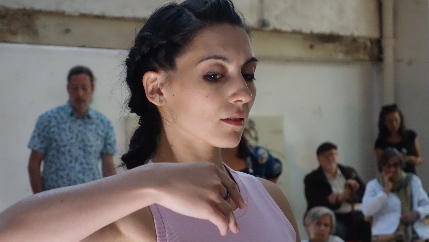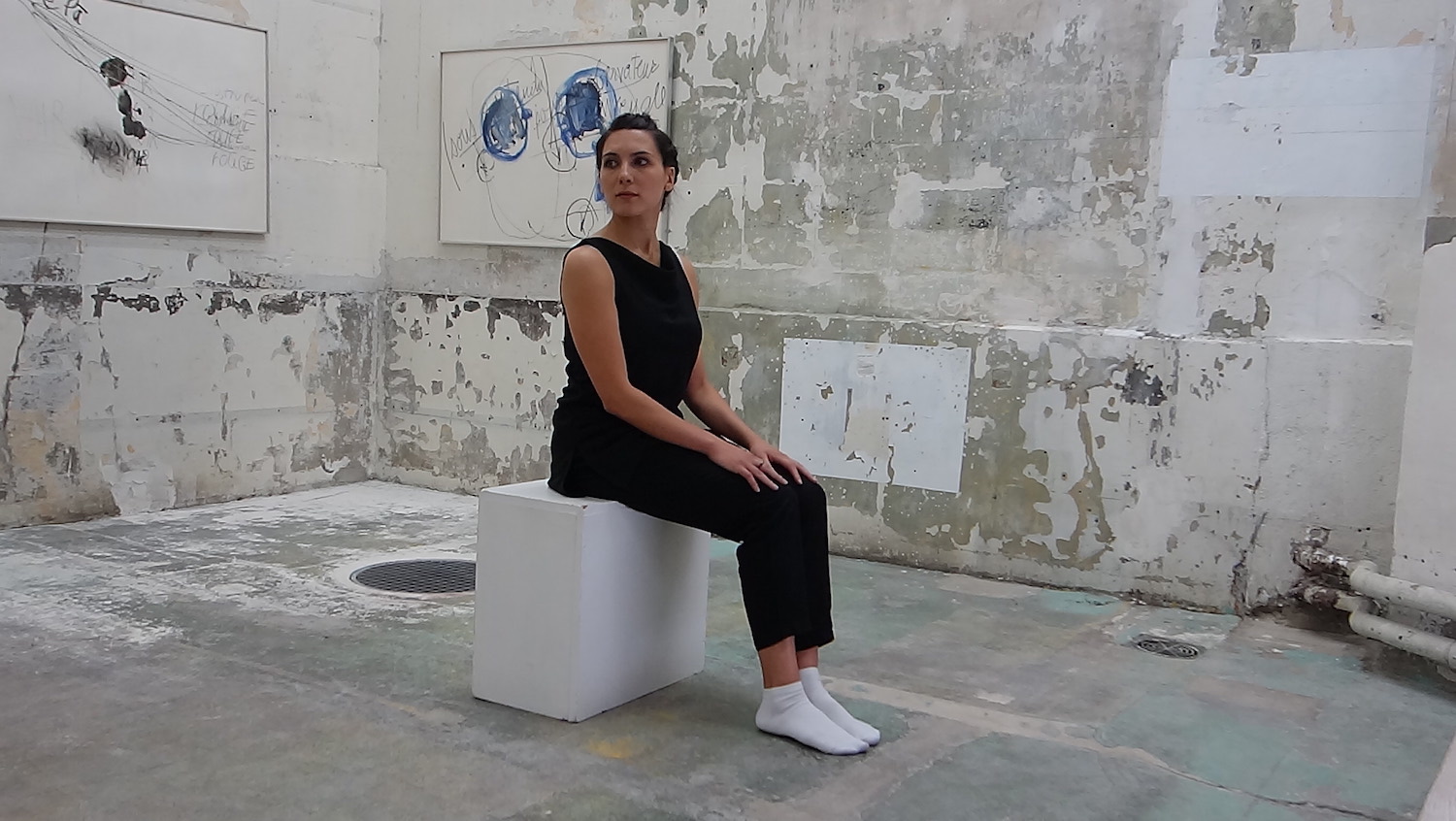 La danseuse, de noir parée, en socquettes immaculées, les cheveux retenus par un chignon, est longiligne, hiératique, olympienne. En un premier temps immobile, elle demeure assise sur un tabouret, prend la pose, aligne une série de postures, panoramique du regard en offrant un profil puis l’autre aux spectateurs. Les uns se tiennent debout, les autres sont assis sur la marche qui sépare des deux salles ou bien posés à même le sol. On dirait que la musique, signée du jeune compositeur Leonid Karev, dicte le tempo à la jeune femme. Le mouvement s’accélère, jusqu’à devenir impétueux.