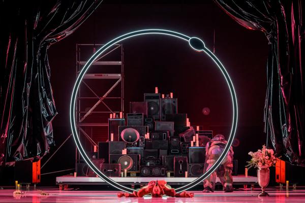 C’est donc avec des demi-levers de rideau qui laissent entrevoir les premières scènes en bandeau, un peu comme des plaques de lanterne magique, que commence un ballet-bouffe très théâtral campé dans un décor foisonnant d’une multitude d’ éléments scéniques symboliques et signifiants, parfois un peu énigmatiques – un rideau central laqué noir, un immense cœur au dessin anatomique, un cercle en néon s’abaissant et s’orientant selon, un cercueil déambulant ou des guirlandes aux loupiotes de fête foraine …