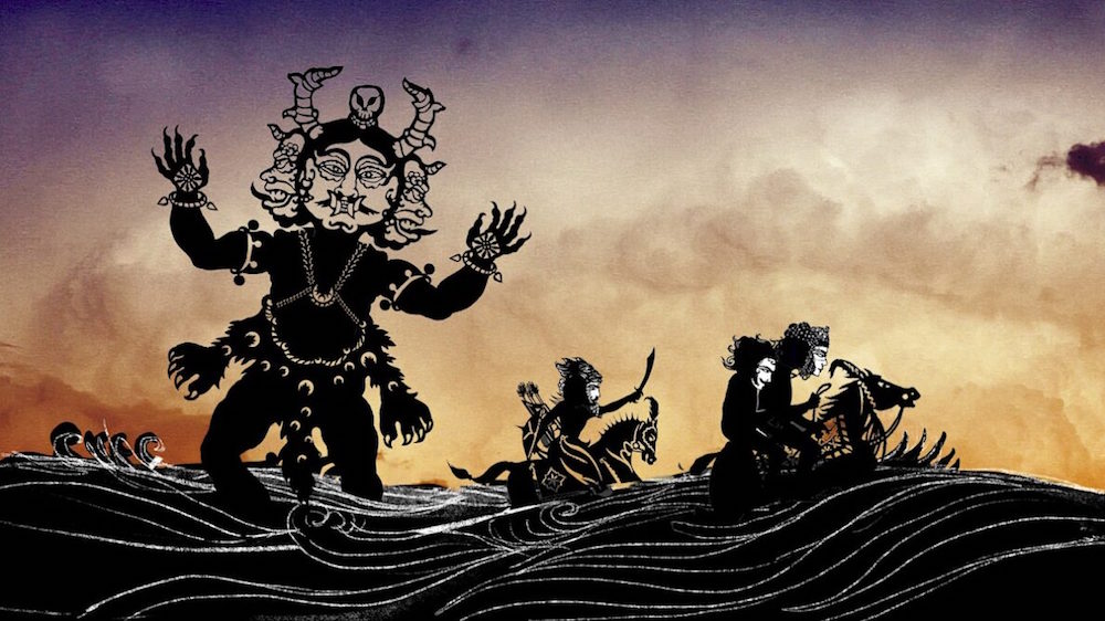 Derrière la toile tendue au maximum, les acteurs-danseurs manipulent 500 figurines représentant personnages, éléments de la nature, châteaux, armées, fleuves, démons, ornements... Les sept manipulateurs prêtent leurs corps aux protagonistes, se fondant dans les figurines. La gestuelle est soutenue et expressive, comme pour un film muet. Mais les dialogues viennent, en anglais et surtitrés, de la bande son.