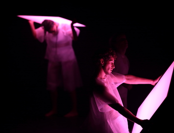 Quelque chose de crépusculaire et de dévasté : dans un air enfumé, un chaos de blocs sombres, à cour. Des corps y gisent. Dès qu’ils s’animent, ils commencent à déplacer ces modules carrés et les empilent en une sorte de mur ; très rapidement, ces cadres se révèlent mobiles et lumineux, diffusant des teintes changeantes (pilotées depuis la régie). Ils vont structurer la pièce, poussant la gestuelle vers des postures de soutien, d’effort, d’architecture, quand les six interprètes les transportent, les déposent au sol, les soulèvent à bout de bras. Pas simple : ils pèsent une vingtaine de kilos… Mais l’imaginaire se projette et peut y trouver des ouvertures, des fragments de ciel, des surfaces d’écran ou des reflets miroitants ; ou simplement des cadres lumineux qui fabriquent un univers…