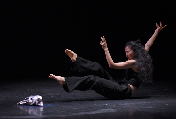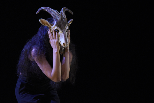 Tout commence donc par un solo très impressionnant, dansé par Sun-A Lee. Coiffée d’un masque de bouc, avec ses pieds hyper cambrés, et ses bras qui berceraient le vent, elle déploie une gestuelle tout en lenteurs, calée sur la respiration, où chaque détail concourt à la justesse de la position et à son expressivité. Ses mouvements qui se tordent et s’arrondissent, tandis que l’appui des jambes, comme leur force dirigée vers le sol, évoquent immanquablement la danse de la « Sorcière » de Mary Wigman (1914), mais aussi une animalité étrange et proche, comme issue d’un lointain intérieur. Le travail sur la vitesse et la désarticulation couplé à des arrêts saisissants finit par induire une forme de narration et de personnification attachante, que le masque est pourtant censé empêcher, tout en atténuant toute distinction de genre… Et plutôt que nous demander qui est ce jeune bouc en costard qui cherche à nous impressionner par ses poses viriles, nous sommes touchés par la fragilité de ce frêle bouquetin qui détale avec une respiration forte et sifflante comme ses vrais congénères ! Quand cette étonnante créature mi-humaine, mi-animale, se déshabille et ôte son masque, .elle le regarde, bouleversant face à face de soi et de l’autre en nous, et le pose comme on quitte l’enfance.