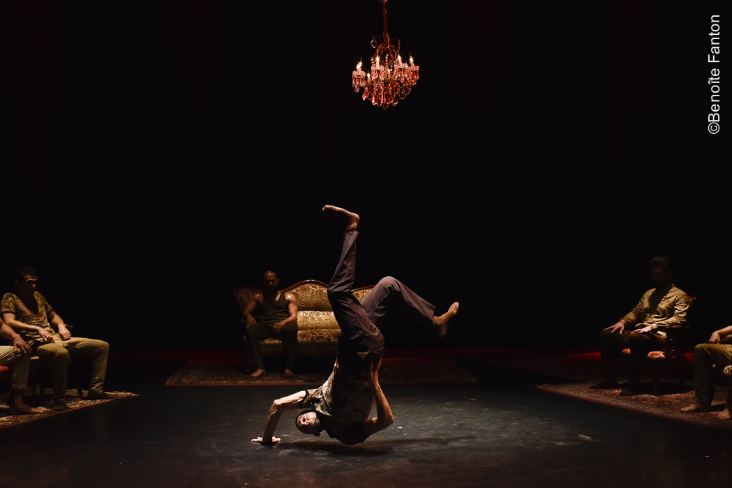 Six danseurs et six places assises, dont deux sur un énorme canapé. Quatre tapis d’Orient, deux lustres. Dans ce salon bourgeois du XIXe siècle, dans lequel s’introduit aussi un petit tapis de prière, six hommes conversent, par leurs gestes, par leurs corps.