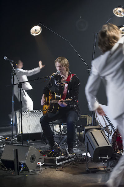 Car tout le talent de cet opus réside dans le fait que musique, scénographie et danse s’incèrent entre eux sans aucune fausse note. Les compositions de Peter oscillent entre pop et rock, sa voix enrôle le public dans un univers très poétique. Il y a chez lui du Gene Vincent, soit le rockeur au cœur tendre et à la fois du Rimbaud dont les notes semblent fragiles mais pour autant très étudiées et très maitrisées.
