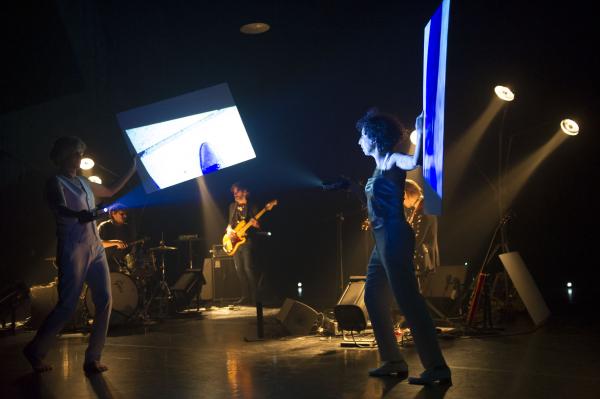 Cette création est un hommage à la musique, à la danse et à des effets visuels qui s’imbriquent entre eux avec une étonnante et délicieuse évidence. Tout autour du trio composé de Peter von Poehl à la voix et guitare, Antoine Boistelle aux percussions et Frédéric Parcabe à la basse, les deux danseurs installent de petites lumières en forme d’œufs afin de délimiter le plateau. S’ensuit sur chaque morceau une chorégraphie très raffinée. Les petites lumières bougent ou s’effacent pour donner lieu à des images scintillantes projetées sur des tableaux blancs à l’aide non seulement de vidéos mais surtout grâce à des jeux provoqués par des objets hétéroclites maniés par les danseurs. Grâce à cette mobilité, boule de cristal et lames circulaires propagent de splendides dessins.