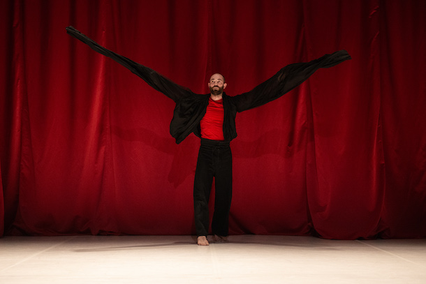 Pour toute scénographie, Julie Coutant a choisi un rideau de scène rouge soyeux au fond du plateau dont on comprend très vite qu’il sera un élément central de la dramaturgie : il s’entrouvre au centre dans un drapé délicat qui laisse passer les trois interprètes, Jérémy Kouyoumdjian, Armelle Dousset et Julie Coutant. Tous vêtus d’un large pantalon et d’une chasuble noire, il les porte avec les bras de chaque côté avec une infinie délicatesse. Elles apparaissent telles de belles dormantes et cette sieste va se prolonger au sol alors que les trois corps sont entrelacés et se déplient. Tous semblent atteints de narcolepsie et plongés dans un rêve délicieux.