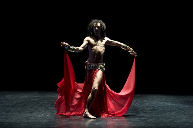 Cette double transgression des rôles attribués au féminin et au masculin renvoie la société à ses tabous et ses lignes de conflit et à son homophobie. Et elle interroge le regard sur le corps exposé en scène. Car Paulikevitch entre en scène nu, « pour assumer mon corps, non pour provoquer » et enfile une robe rouge pour se transformer en danseur de baladi. Ce qui n’existe pas, ou presque.
