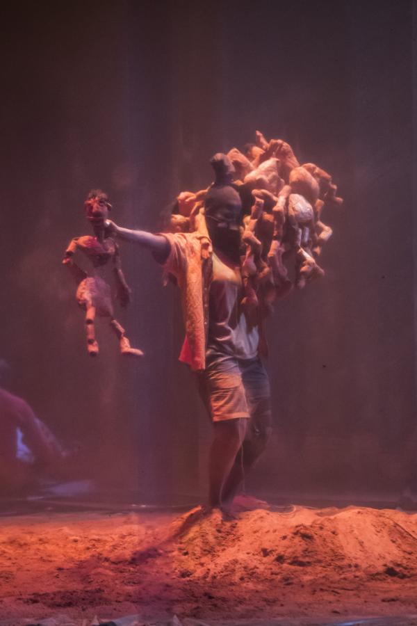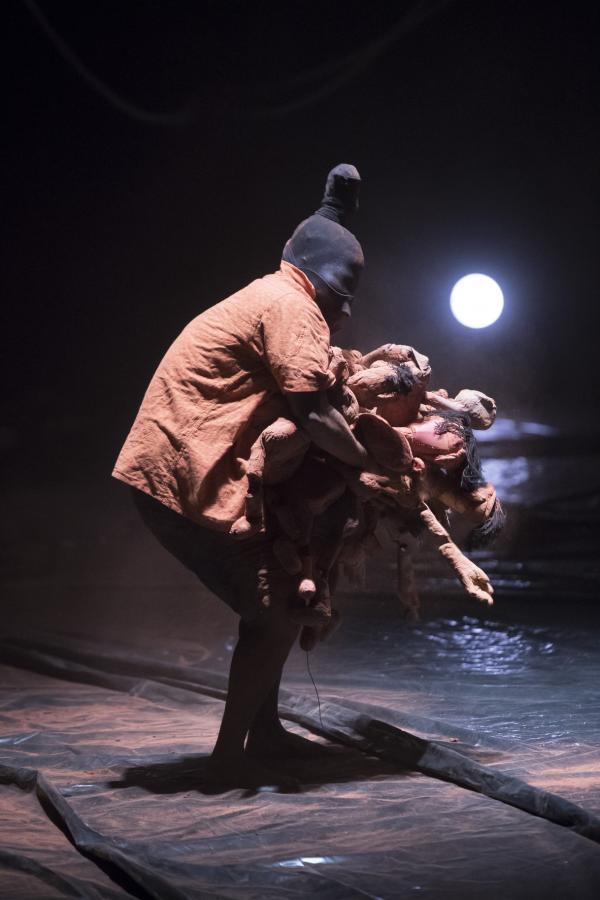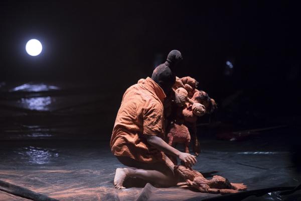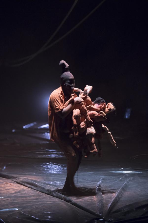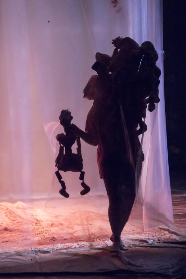 De cette terre sont faits des poupons archaïques, disposés en bord de plateau. Un très grand cube de plastique transparent occupe une bonne part de celui-ci. Un performer, à la silhouette laissée indistincte, s'y emploie à confectionner des boules, elles aussi de terre. On pourrait encore mentionner de grands cordages, suspendus en hauteur au-dessus de la salle pour terminer à un angle de la scène. On imagerait bien pareille installation dans la marine ancienne, ou le cirque d'aujourd'hui.