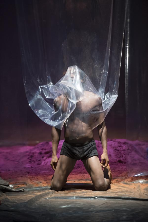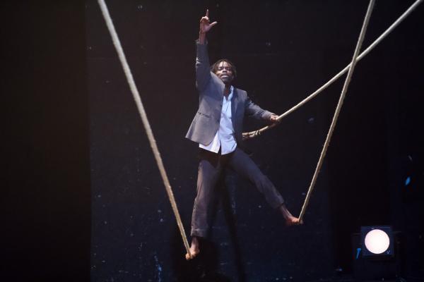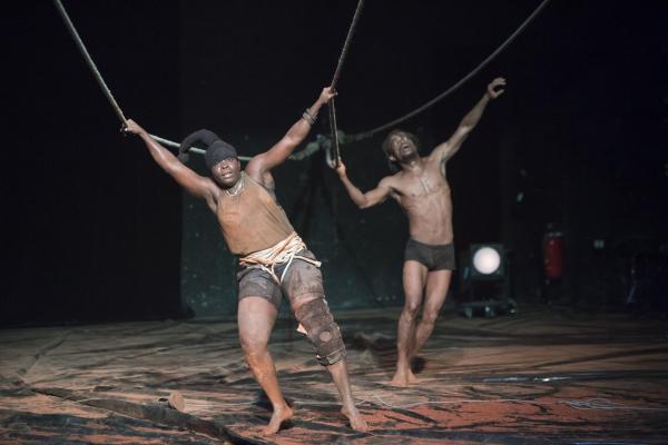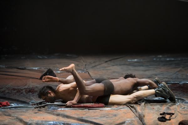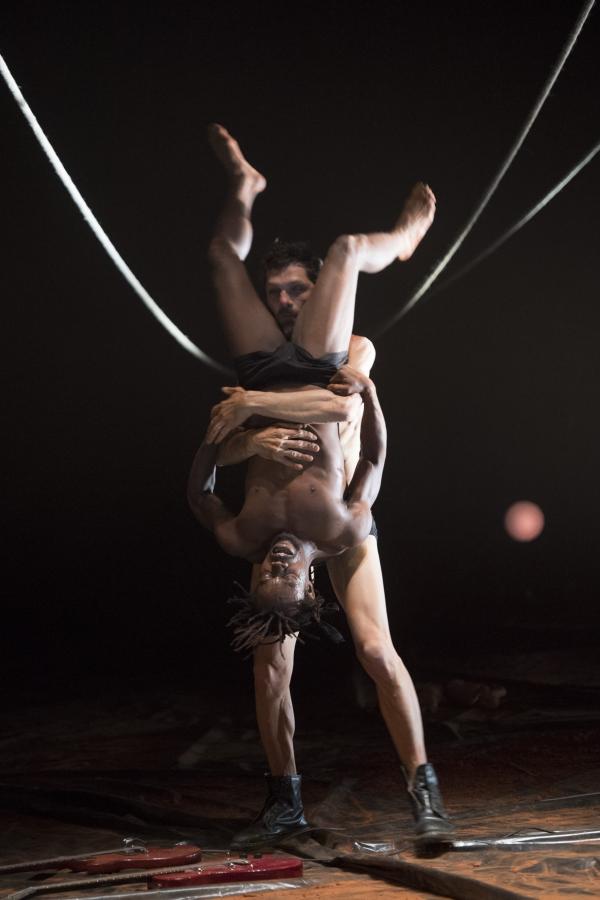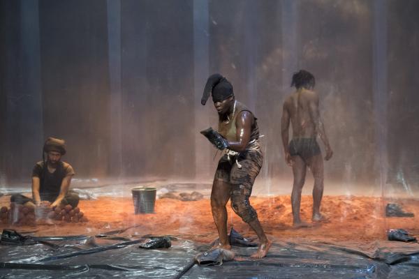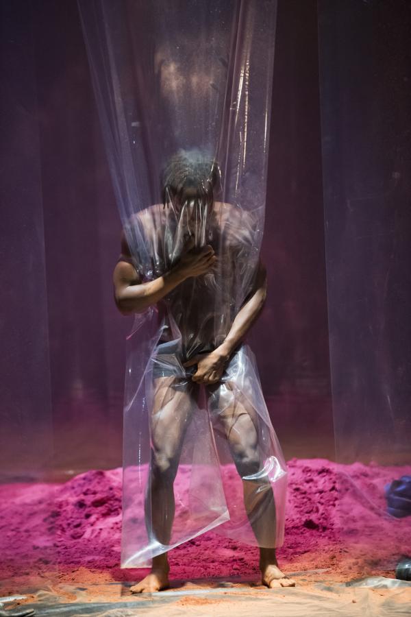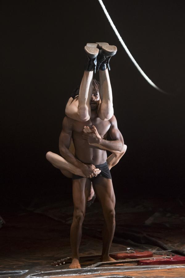Pour les actions de Tapis rouge, tout cela va favoriser des effets d'entrées, de sorties, de suspensions, de sauts, de lancers de projectiles. On y ressent volontiers des charges symboliques, sans être forcément à même d'en décrypter les significations. Du reste, si rien n'est sobre dans Tapis rouge, pour autant les options prises par Nadia Beugré ne sont pas celles de la narrativité linéaire, mais plutôt du cut et du collage. On voit bien l'envie de tranchant, et d'impact, qui est ainsi poursuivie par la chorégraphe ivoirienne, signant là sa première pièce en grand format après quelques essais solistes.