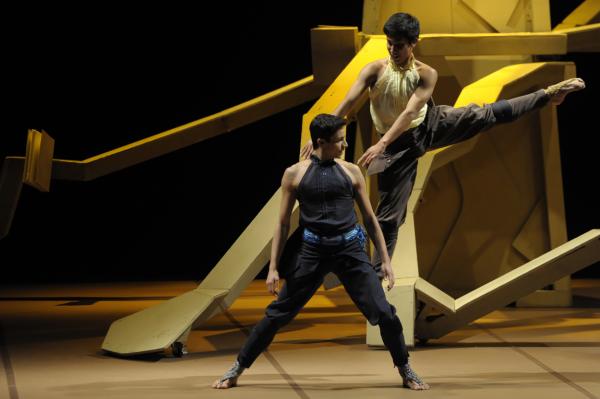 La gestuelle, on l’a dit, est athlétique. Les danseurs se lancent de la structure de bois, se suspendent, s’étirent à l’extrême en s’accrochant aux « branches ». On ne compte plus les « six o’clock » (selon le terme consacré par Sylvie Guillem), les sauts à l’écart et même retombés sur pointe, les manèges de grand jetés en tournant ahurissants, en lancés de partenaires féminines dans le vide.