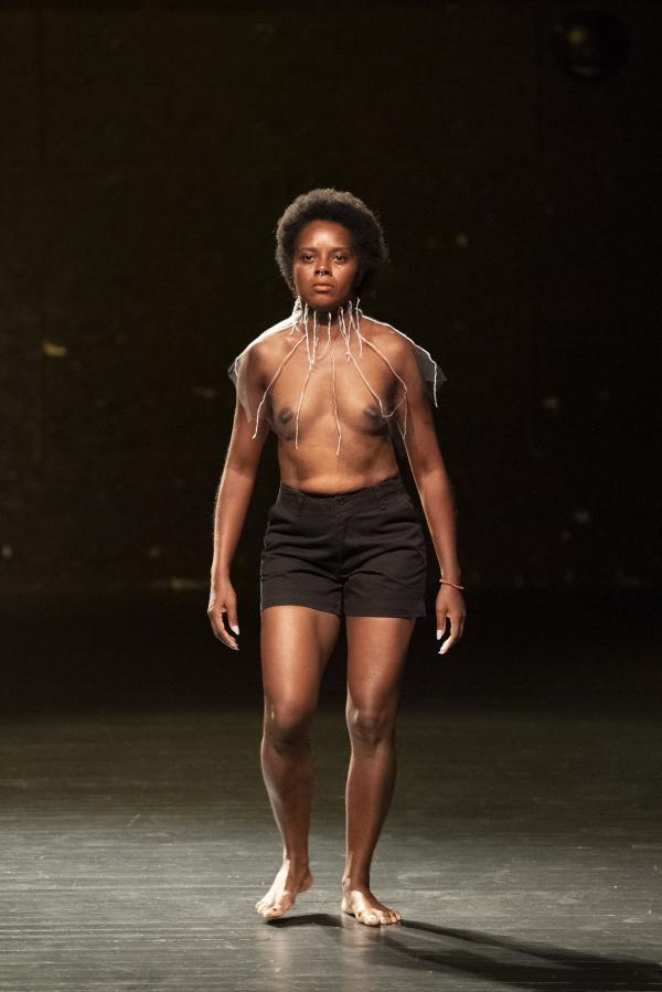 Les tenues se résument à un short noir, pour les femmes comme pour les hommes sauf pour un.e. Etat nature et minimaliste en même temps, la quasi-nudité évoque les populations amérindiennes qui vivent en harmonie avec la forêt amazonienne. Evelin dit vouloir leur donner une visibilité, mais le formalisme et l’abstraction de la danse cachent ces populations plus qu’ils ne les révèlent.