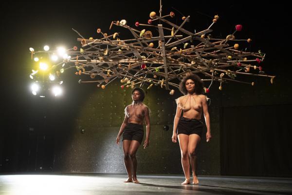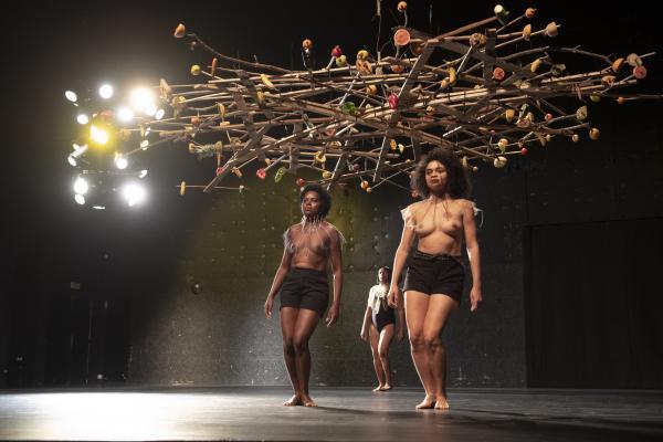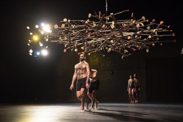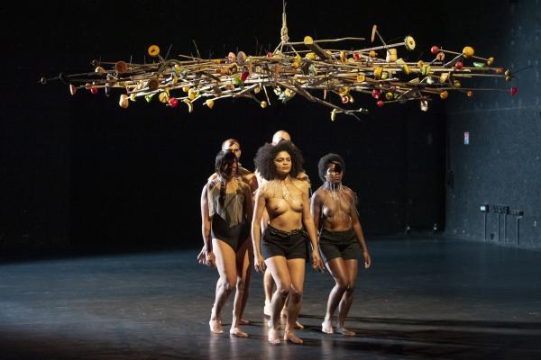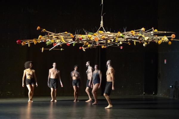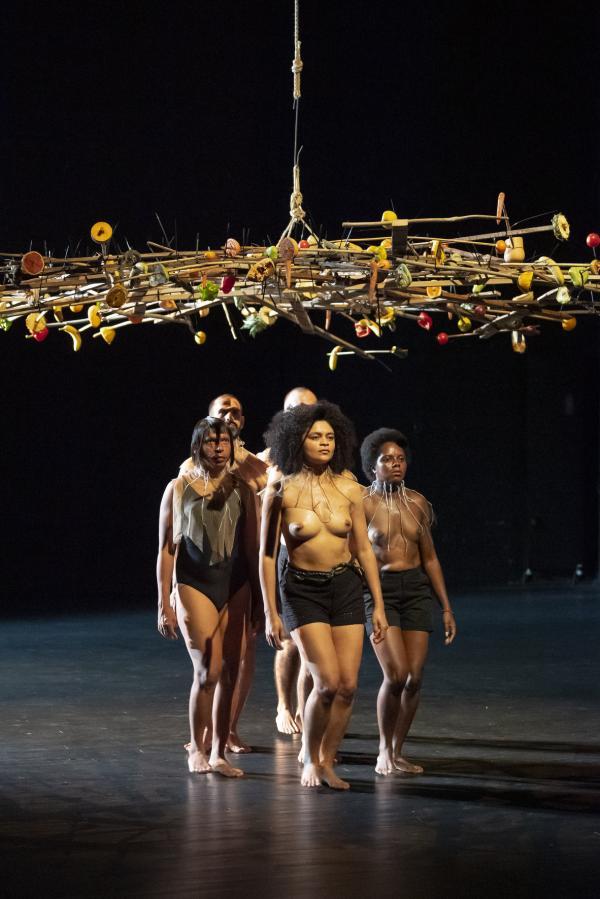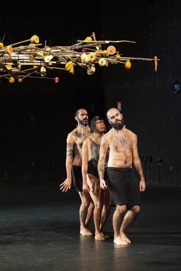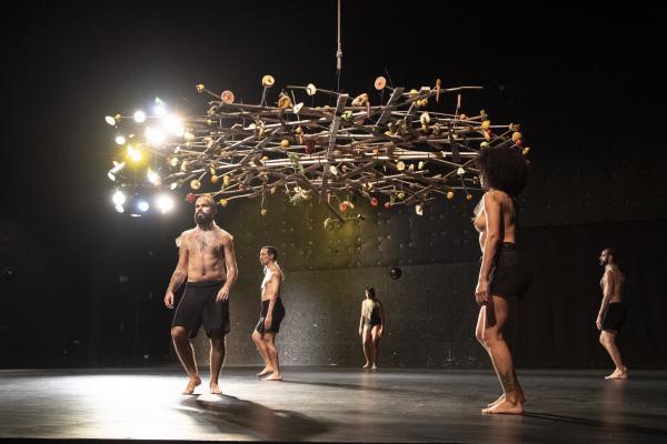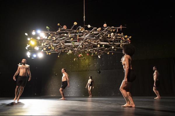 « L’uirapuru est un oiseau en voie de disparition qui est en même temps une icône de la culture brésilienne. Il n’apparaît presque jamais et a un chant absolument sublime. Il y a autour de lui une légende indigène basée sur un amour impossible à base de chamanisme », dit Marcelo Evelin. Selon la légende des Tupi-Guarani, qui entend cet oiseau se mettrait à délirer sous l’emprise d’une beauté insensée. Cet oiseau, Beckett l’appellerait Godot. Et si Beckett avait écrit un scénario chorégraphique, celui-ci pourrait ressembler à Uirapuru, pas de six très minimaliste signé Marcelo Evelin, où une boucle rythmique et un motif chorégraphique répétés inlassablement pendant une cinquantaine de minutes, est placée sous une sorte d’arbre, de parapluie ou nid d’oiseau, fait de bouts de bois et garni de fruits et de légumes.