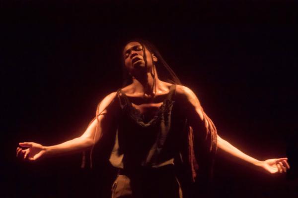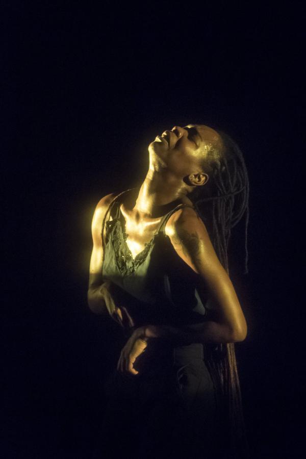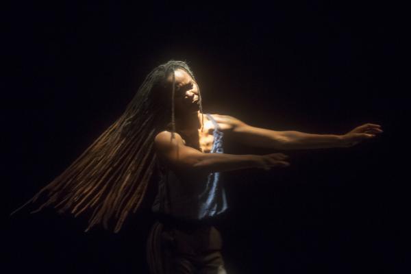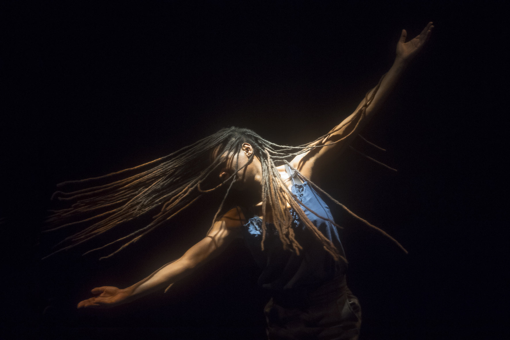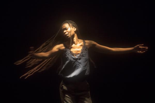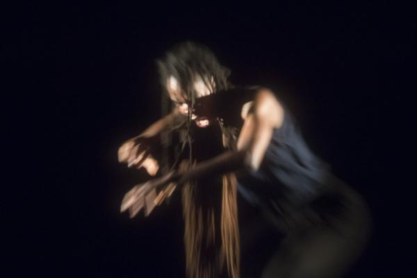 Changement de décor à tous sens du terme, puisqu’il nécessitait un véritable entracte : In Between, de et avec Ingrid Estarque, mettait en scène une figure familière du théâtre Jean Vilar, qui s’est notamment illustrée dans (S)acres de David Drouard, et lors la soirée des 25 ans du festival. Revendiquant sa filiation avec l’univers de la Cie 14.20, spécialiste de la magie nouvelle, elle commençait par apparaître puis disparaître grâce à un jeu de lumières, ou plutôt de noir, à chaque fois vêtue d’accessoires différents pour ajouter au trouble du spectateur. Ces allers retours volontairement déroutants installaient un climat de mystère que prolongeait bientôt une transe hypnotique à la façon des derviches tourneurs. Tourbillonnant sur lui-même, le long corps à la fois délié et athlétique de la danseuse entrait en connexion, dans une sincérité touchante, avec son moi le plus intime. Là encore, quasiment pas ou peu de hip hop stricto sensu, mais un état de corps proche de ceux du krump porté par une énergie qui, si elle ne s’extériorisait pas de façon démonstrative, n’en était pas moins intense. Toute entière livrée dans ce solo authentique, Ingrid Estarque réussissait, même de façon encore imparfaite, à créer une présence et une esthétique.