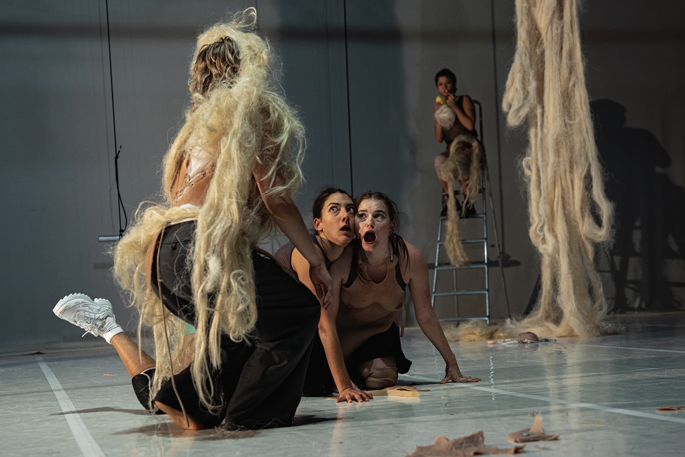 Tout ceci est difficile à représenter sur scène, par des danseuses bien vivantes et décidées à ne pas se laisser réduire à des modèles morbides. D’où une division du projet de Sarah Baltzinger en un spectacle et une installation, avec des touffes de cheveux blonds pour faire le lien entre les deux. Sur scène, ces mèches, très blondes et très synthétiques, à la fois chevelure sauvage et cheveux d’ange, descendent des cintres à l’état brut et renvoient aux états fantasmagoriques projetés sur la féminité, jusque dans la figure romantique de la jeune fille et la mort.