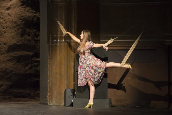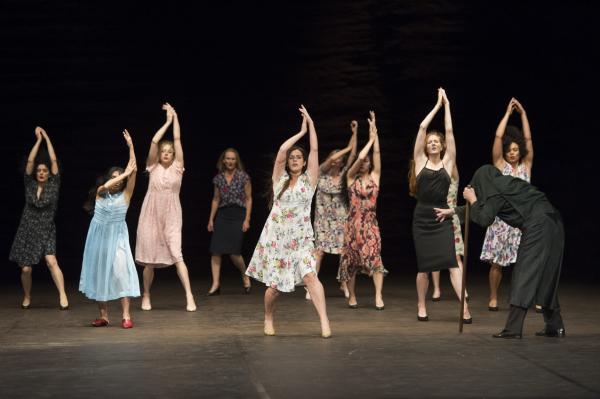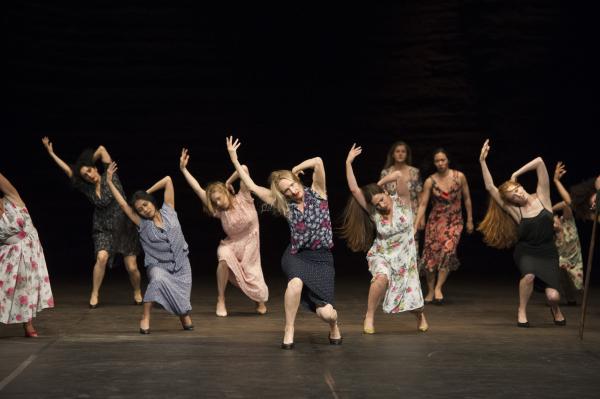Succession de saynètes cinématographiques, la leçon de Fellini est partout présente dans la façon de les organiser, de croquer les personnages, de camper des ébauches de récit aux allures de rêves. La femme sans bras incarnée par Julie Shanahan, une vente aux enchères hallucinante « tenue » par Cristiana Morganti, l’avancée assise « en cheveux » de Breanna O’Mara, les déambulations penchées, les femmes perchées sur les chaises (souvenir de Nelken), la présence formidable de Julie Anne Stanzak notamment dans la scène du « chaos », les femmes accrochées à des portants comme de vulgaires chiffons qui fait écho à Julie Shanahan portant ses robes comme autant d’ailes, et bien sûr, le passage où chacune se balance accrochée à des anneaux.