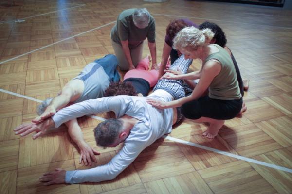 À chaque fois, les gestes sont aussi minimaux qu’émouvants, tout comme la mise en scène qui n’a besoin que de quelques chaises en plastique pour cette fresque grandiose. Il suffit de peu pour traduire l’atmosphère des tableaux connus dont ils sont le prolongement tant cette gestuelle nous a été transmise par tout l’art occidental et de ce fait, peut prendre place dans nos corps et être immédiatement lisible. Mais soudain, on se prend à retourner cette affirmation. Les tableaux n’auraient-ils pas plutôt reproduit ces gestes archaïques sinon instinctifs.