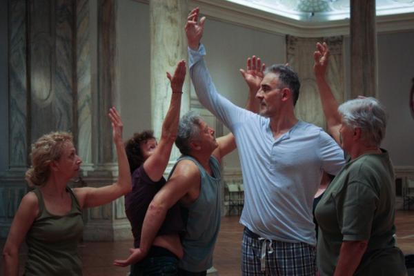 Il y a cette femme âgée, assise, qui tend les bras, palpe ses mains et ses jambes, se lève très lentement, et se rasseoit sur la chaise vide Presque rien. Mais dans chacun de ses mouvements on lit le temps qui a laissé ses traces, elle regarde ses mains, porte ses yeux au loin, et ça suffit à nous plonger dans des réflexions infinies. C’est le tableau de La Crucifixion.