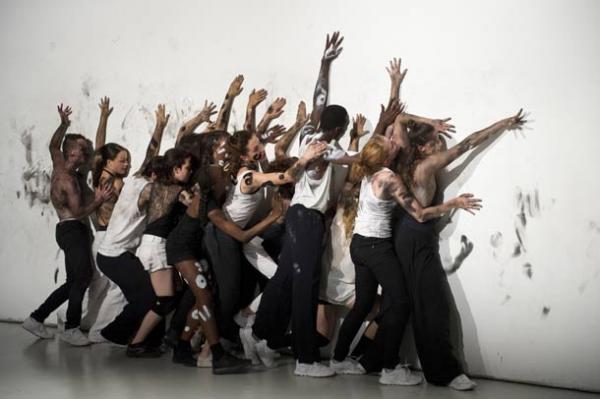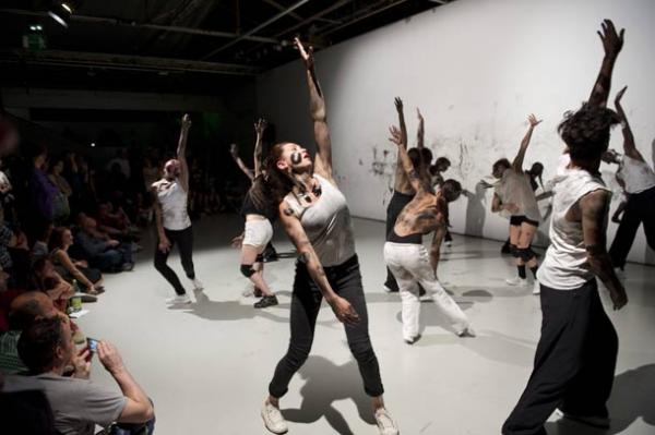 C’est alors que les élèves d’ACTS s’élancent dans la galerie pour une chorégraphie de groupe très organique, presque animale dans leur façon de se mouvoir créée par Jérémie Bélingard en collaboration avec le plasticien Aung-Ko. Sur la musique de Keiichiro Shibuya, vêtus de noir, leur chair soulignée par des traces de peinture de la même couleur, ils ressemblent à une tribu inconnue, surgie d’un passé ou d’un continent disparus. Toujours en mouvement, ils sont houle, vent, nuée, développant un système cognitif de communication secret. Ce sont eux qui traceront The Way of the Rabbit, cet animal subtilement rapide qui semble attendre avant de disparaître brusquement. Ils accompagneront la suite de l’événement où l’on pourra voir Marie-Agnès Gillot et Benjamin Pech tracer dans le sable de Délos des bribes de la « danse perdue », ce Choros de sable dessiné sur le bouclier d’Achille avant que n’y retourne le sable dansé.