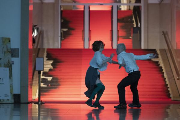 Ainsi secoué, on remonte éventuellement en direction du grand escalier et de son tapis rouge, où il peut arriver que l’on voie débouler un drôle d’intrus tout de blanc vêtu, poursuivi et rapidement éconduit par deux agents de sécurité. L’altercation furtive laisse planer un soupçon de festival de Cannes, puisque c’est pour les marches du Palais des Festivals que la performance a été créée. Détournement dans le retournement : Au lieu d’une montée solennelle, (La)Horde propose un chamboulement en cascades, sur un tapis rouge qui semble avoir brûlé sur les bords et s’affiche dans un rouge-et-noir parfaitement anarchiste.