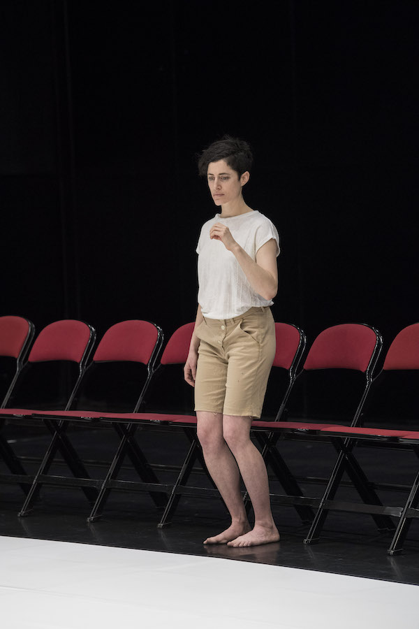 Elle et ses deux danseurs associés, Gabriela Ceceña et Ido Batash, mettent donc en valeur les articulations ; en évidence le tranchant de la main ; en crise la coordination ; en branle les tensions, les palpitations, les crispations. La rupture n’est jamais loin. Ni la cassure. Ni la fêlure. Le regard d’aveugle jeté par Ido à ses partenaires de jeu est à cet égard signifiant. On ne saura rien de ce que ressent l’interprète, visiblement ailleurs. On n’en apprendra pas plus du souvenir-écran de la chorégraphe qui dit avoir puisé dans son vécu les motifs agencés sur le tapis de sol immaculé de l’ancien relais de poste des Hauts de Belleville. Les trois danseurs, après une longue période de solitude, finissent par former trio. Le pas de trois, dès lors, tient du jeu des quatre coins. Les appuis pourtant feutrés et filtrés produisent un léger crépitement sur le plancher tout juste refait.