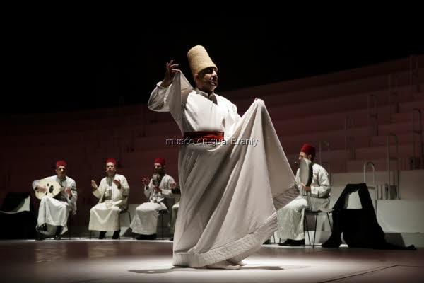 À esprit blanc, costumes blancs et une scénographie en parfaite symétrie. Les derviches tourneurs vrillent d’une verticalité immaculée, devant l‘extrémité gauche ou droite des musiciens, voire au centre. Chaque posture des bras ou de la tête a sa signification : « On reçoit du créateur et on distribue aux créatures. Il y a la main gauche pour symboliser la terre et le mal, la main droite pour le ciel et le bien. Comme le yin et le yang », expliquent-ils après le spectacle, lors d’une rencontre avec le public.