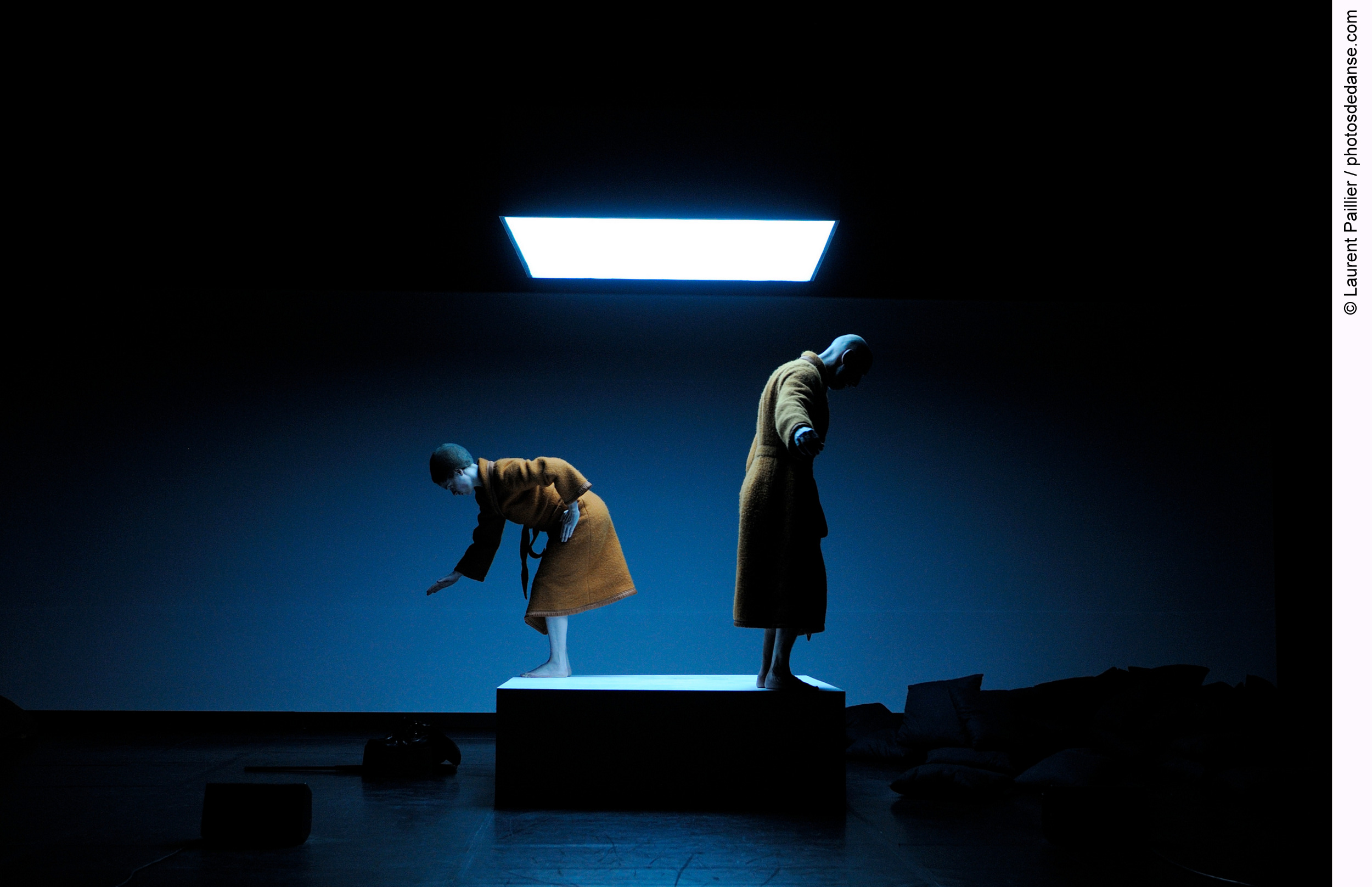 Air place cette fois les spectateur entre des chanteurs enfermés derrière eux dans une cabine (comme celles utilisées pour la traduction simultanée) et la scène face à eux. Brouillant définitivement la source vocale que l’on entend parfois comme émanant des danseurs (Vincent Dupont et Aline Landreau) parfois sortant de l’arrière des gradins. Cette bande-son créée en live par quatre chanteurs (Anne Garcenot, Valérie Joly, Fabrice Augé-Dedieu et Wahid Lamamra) est une performance vocale complexe, qui joue sur tous les registres de la voix et le mélange de tessitures, qui fait souvent penser à des chants diphoniques tibétains ou des chants de gorge sibériens qui font immanquablement référence à un rite chamanique ancien. Et la transe est effectivement une des composantes de ce spectacle, car à l’origine de Air « il y a, raconte Vincent Dupont, une image persistante. Elle vient d’un film de Jean Rouch Les Tambours d’avant. […] Rouch entre dans un village du Niger avec sa caméra à l’épaule pendant une danse de possession. AU début, cette danse ne marche pas et puis à un moment une femme sort du rang, commence à danser et à crier et on comprend très vite que c’est parti. Ça commence dont à marcher mais c’est la fin de la pellicule, alors il fait un travelling arrière sur cette femme, ce village et il propose d’imaginer la suite. C’est ce que j’ai fait. »