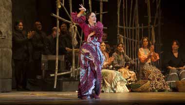 Yerbabuena rend hommage à Frederico Garcia, sans l’écraser sous l’admiration. Une gageure. « Frederico segun Lorca » ne raconte pas la vie du poète, et propose pourtant un véritable théâtre de danse, basé sur flamenco et danse contemporaine. Tableau par tableau, la pièce se déroule devant un mur de pierre qui peut, selon les projections vidéo, rappeler l’église du village, la maison (sans doute celle de Bernarda Alba) et autres. Et Yerbabuena de jouer la mère, toute de noir vêtue, dans un registre très dramatique, plein de suspense et dansé dans un esprit proche de celui d’Israel Galvan, mais en plus arrondi, plus fluide. Chaque mouvement est une révélation, chacune de ses attitudes semble jaillir de la terre pour brûler ou pétrifier l’entourage. Elle incarne là toute la violence refoulée dont la société rurale dont Lorca parlait si bien. Mais la Yerbabuena est fortement défiée par deux autres solistes, au cours de la fête du village. Et même ce tableau, le plus traditionnel et réaliste de tous, est dégagé de tout folklore. Chaque partie a par ailleurs un rapport au rituel, qu’il s’agisse de confession, de rencontres nocturnes ou d’envols oniriques. Chanteurs, musiciens et danseurs se complètent à merveille. Et on sortirait de là comme sur un nuage, si le format du spectacle adoptait plus de modestie. Quand Yerbabuena a dansé son majestueux solo dans lequel elle expie tous les démons de l’Espagne, dans lequel elle montre une fois de plus à quel point elle sait dynamiser la réinterprétation contemporaine de la tradition, qu’y a-t-il à rajouter? La beauté d’un hommage ne dépend pas de sa durée!