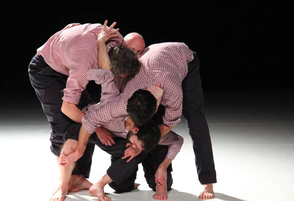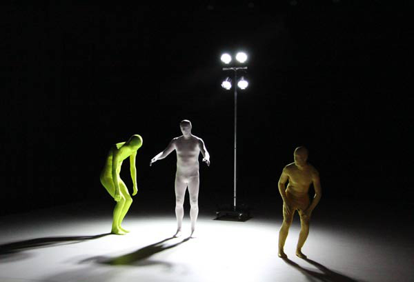 Or, c'est toute la scène qui est saisissante, au-delà de la maladroite action conduite : dans leurs combinaisons, les performeurs sont modelés comme des abstractions corporelles, qui gomment les paresses de lecture des morphologies standards, et en accentuent des proportions d'étrangeté et de projection. Cela commence par exemple par des différences de tailles considérables. En découle une mise en tension marquante, un fait chorégraphique en soi, où les corps s'ingénient à parler un langage de présences, de flux, de niveaux et de plasticité, captivant à l'œil, mais apparemment étranger à l'intention énoncée.