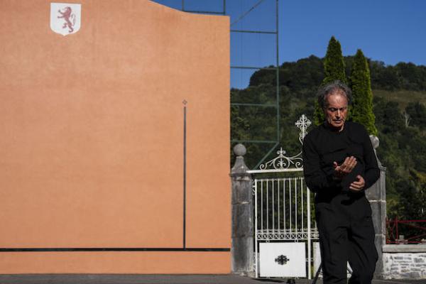 On est partis pour un tour dans les villages. Le Temps d’aimer essaime autour de Biarritz, assez loin parfois, dans la montagne, à une petite heure de voiture en partant de la Gare du Midi. On s’arrête à Itxassou et pour prendre place face au fronton pour voir le duo entre le danseur et chorégraphe Mizel Théret et le musicien, compositeur et chanteur Beñat Achiary, icône musicale de la modernité basque. Mais c’est un groupe en costumes plus ou moins traditionnels qui envahit le terrain de jeu !
