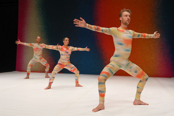 Simple (2021) d’Ayelen Parolin se réfère clairement au ballet moderne – et non post-moderne, comme il nous est dit dans le programme – Summerspace (1958) de Merce Cunningham. Le nom de la chorégraphe rimant avec… parodie, celle-ci a entrepris de pasticher ce classique de l’avant-garde. Elle se prive de la musique de Morton Feldman, lui préférant le silence, le bruit des pas que produit la danse, quelques interjections et deux tubes de variétés entonnés au final. Ayelen Parolin reprend grosso modo les motifs tachistes aux teintes pastel de Robert Rauschenberg qui, pour une fois, agrémentaient les académiques austères obligées.