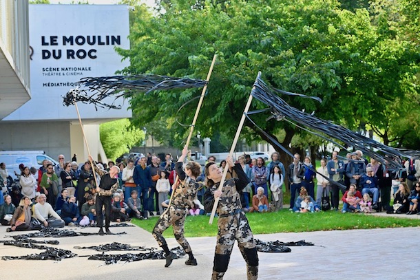La journée ouvrée où nous étions, se sont succédé temps forts et d’autres, selon nous, plus faibles. Commençons par ces derniers. Le très jeune public a fait bon accueil à la création de la compagnie nantaise Météores, Terre-plein, interprété par trois intermittents du spectacle (Ariana Aragno, Raphaël Dupin et Aline Landreau herself) sur le parvis séparant le Moulin du Roc/Scène nationale du monument aux morts de la Guerre de 14 conçu par Pierre Marie Poisson et inauguré par André Maginot en 1923.