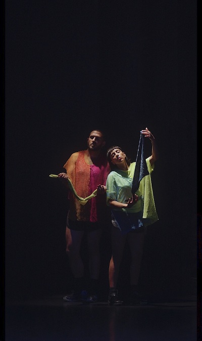 Dans notre interview précédant la création [notre interview], Marcela Santander Corvalán parle de « chorégraphie imaginaire ». Et on imagine. Avec Gérald Kurdian, elle performe une danse cérémoniale, « leur » danse des pêcheurs des îles chiliennes. Et les rues semblent se remplir d'une foule carnavalesque, face à une côte, un port, qui sait... Entre les gradins qui cernent la piste de danse tels les rivages entourent un plan d'eau, le duo en tenues fluo évoque processions, rythmes et musiques festives d'une communauté, entre folklore et culte.