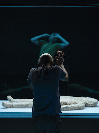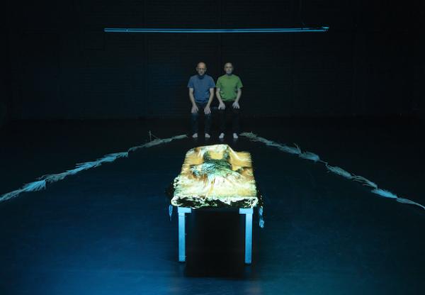 Deux hommes, assis, nous font face. Loin devant eux et plus près de nous prend place une table roulante. On y devine à peine les formes d’une silhouette dissimulée sous le scintillement d’une couverture de survie que recouvrent des branches de palmier. Après nous avoir longuement regardé sans bouger ils se mettent en branle, esquissent des gestes brefs, urgents, fragments qui s’évanouissent dans l’instant qui suit leur apparition, comme un patient entraînement ou une mémoire qui reviendrait par bribes.