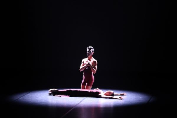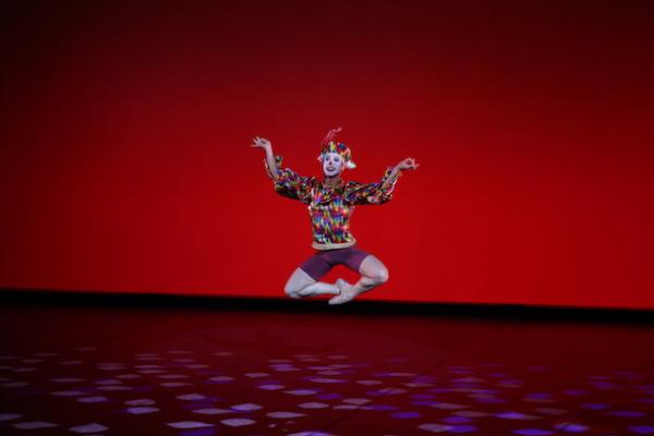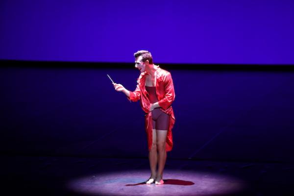 Idolâtrie et ironie cohabitent dans The Dancer(s). Et cela, dès le début du show, avec la prestation clownesque de Nicolas Lazzaro, performance de danseur mais également de mime qui sollicite a priori, avant que nous n’ayons rien vu, nos applaudissements – obtenus aisément, la salle étant pleine et prête à craquer. Le gag à répétition de « L’Air des bijoux » tiré du Faust (1859) de Gounod (voir), diversement traité, rythme, si besoin est la soirée, se référant à la Castafiore d’Hergé. On remarque que le playback est utilisé à plusieurs reprises comme le faisait d’ailleurs Système Castafiore, la compagnie de danse contemporaine de Marcia Barcellos et Karl Biscuit. Un gag efficace résulte du numéro avec, d’un côté, les danseuses exécutant à la perfection les mouvements d’ensemble du ballet blanc et trois costauds en tenue de basketteurs contrastant sinon contrariant le déroulement chorégraphique.