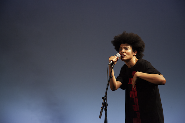 Coiffure afro, de dos, Betty Tchomanga, cantonnée sur un mini-estrade d’un mètre carré, bouge en exécutant une série de mouvements et d’épaulements quasi imperceptibles. À mesure que le geste s’élargit, la danseuse dévoile sa biographie, cette recherche d’une identité artistique qui lui est refusée.