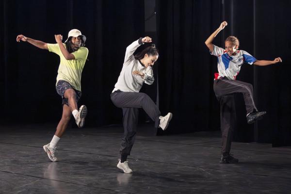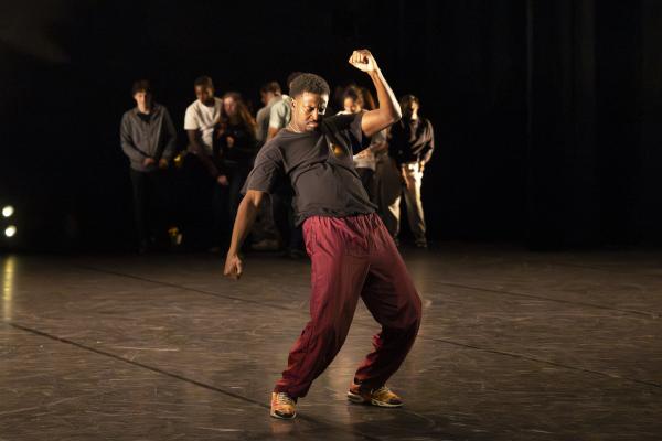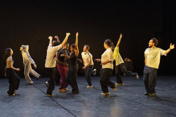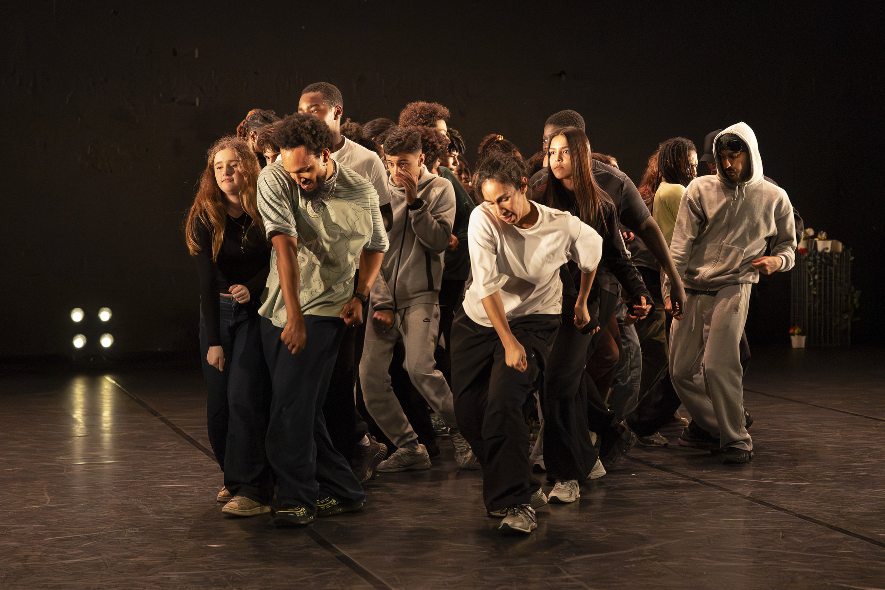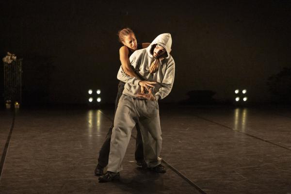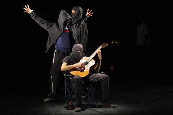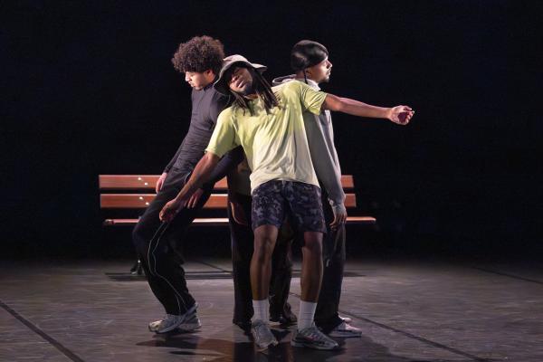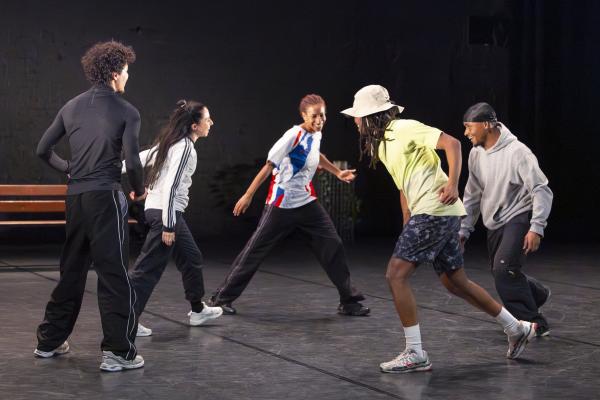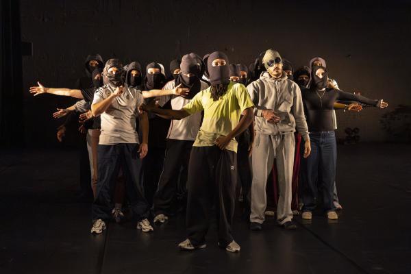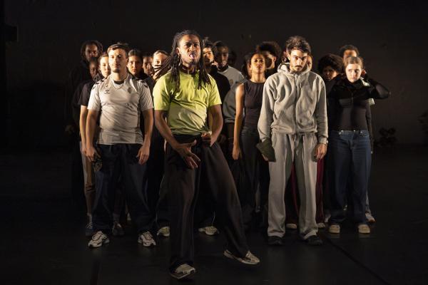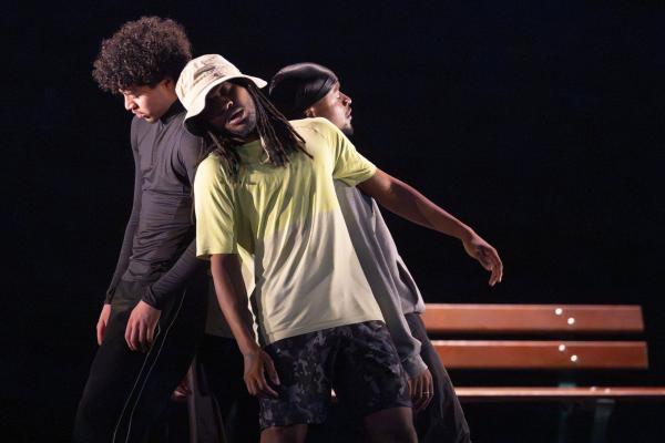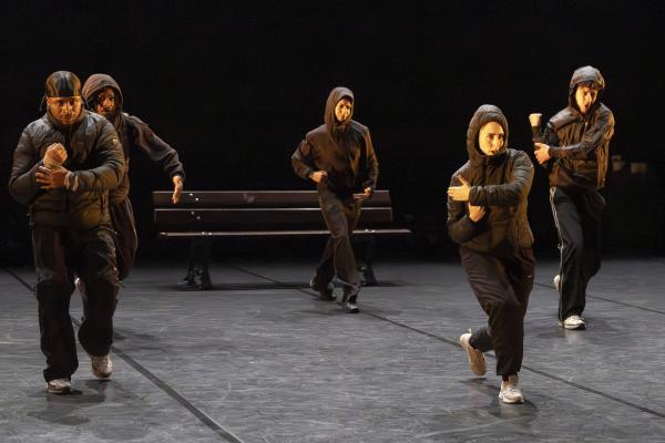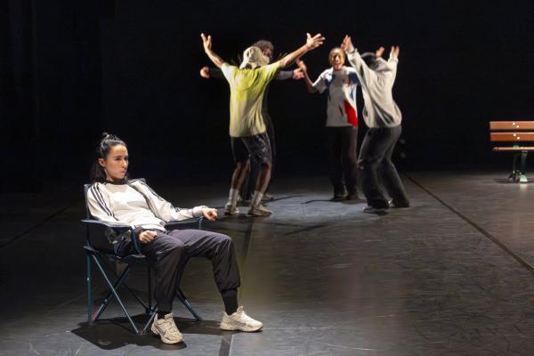 Ils sont trois sur un banc en fond de scène, une affalée sur une chaise tout près de nous. Un autre débarque dans les travées de la salle, gouailleur, rieur, un brin provocateur. « Oui ma gâtée » lance-t-il comme on le dit si souvent à Marseille. Il nous parle du Prado, de nous prendre notre Audi ou plus encore, de « dead ça », avant de grimper sur le plateau pour danser un reggae qui colle bien avec ses dreadlocks. Peu à peu tout le petit groupe s’anime. Ça drible, ça s’embrouille, ça rigole, ça se défie, ça marche à l’unisson, ça se sépare et se retrouve, ça papote. Ça danse aussi, bien sûr, entre figures de break au sol et techno toute en bras. Il y un peu de tension dans l’air, du désœuvrement, mais aussi de la joie et de la complicité, des « hugs », il est encore midi. Quand la pénombre envahit le plateau et qu’un cri retentit, toute la petite bande disparaît dans les coulisses tandis que la musique devient assourdissante. Lorsqu’ils réapparaissent ils sont vêtus de blousons et encagoulés, ils jouent des pieds, des poings, sautent puis se jettent au sol, il est maintenant minuit.