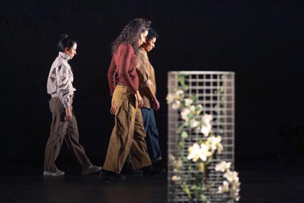 Après que la troupe a quitté la scène, elle se remplie peu à peu de pots contenant des fleurs, de bougies, tandis qu’une danseuse de dos commence à se mouvoir au son d’une guitare sèche. Rejointe par deux congénères, toutes trois entament une chorégraphie qui les voit glisser les mains dans leurs dos, leurs cheveux, baisser la tête, tendre leurs bras et leurs visages vers le ciel. « Il est un peu plus de 15 heures quand retentissent 7 coups de pistolet automatique », « une fusillade depuis tous les trois jours », « la victime a 21 ans » etc. La radio retentit et il est temps maintenant de compter les victimes du narcotrafic, ces morts toujours plus jeunes que pleurent leurs mères, leurs sœurs, leurs petites amies. Et nous aussi puisque grâce à Asmanti nous avons appris à un peu les connaître. Sous un ciel de bouquets illuminés descendu des cintres, les gestes des trois jeunes femmes disent les larmes, les corps qui défaillent, l’abattement, l’entraide, la tendresse et la consolation, la colère et le combat, l’espoir retrouvé avant que n’explose à nouveau le terrible son des kalachnikovs.