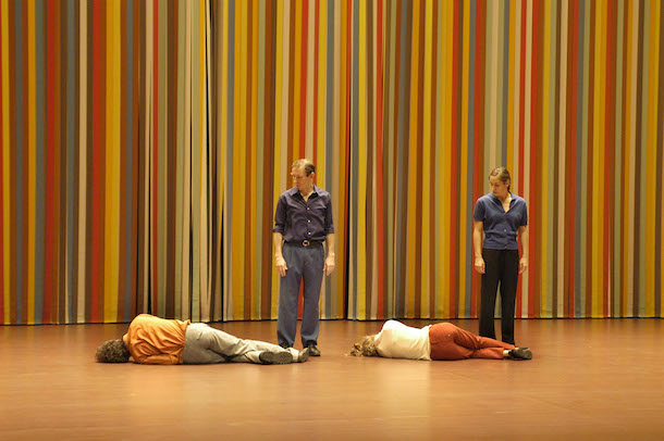 La composition inaugure un processus que la chorégraphe va souvent exploiter : la répétition obstinée. Cela entre en traversant les bandes plastiques, cela s'arrête soudain, ou face à une autre entrée pareillement, repart, retraverse. Parfois un corps tombe depuis le hors scène. Cela ne semble pas surprendre les protagonistes. Parfois ils écoutent ou craignent ce qui se déroule de l'autre côté des bandes colorées, parfois ils courent et stoppent. Toujours ils reprennent. Pas de ligne dramaturgique permettant de se raccrocher : l’éternel retour du même. Cela contribue naturellement à une certaine angoisse… Mais ce processus, traité avec plus de détachement et moins de gravité, c'est exactement le style d'Ambra Senatore pour Passo (2009). Parfois le mouvement rompt avec l'expression, se structure à partir de plusieurs entrées aux courses interrompues ; tous semblent suspendus, dans l'attente, et dans un unisson parfait, s'engagent dans un pattern à la composition savante autant que millimétrée. C'est exactement ce que l'on retrouve dans la composition de Thomas Lebrun. Et ainsi, convoqués par des bribes chorégraphiques, ce qu'il y a de mieux dans la danse de ces vingt dernières années repassent en germe dans la pièce. Parfois, quand les danseurs se campent face public, immobiles, d'une immarcescibilité marmoréenne, c'est tout Maguy Marin et le processus qui va aboutir à Umwelt, certes, mais ensuite à Turba (2008) et les pièces suivantes…