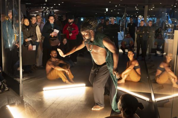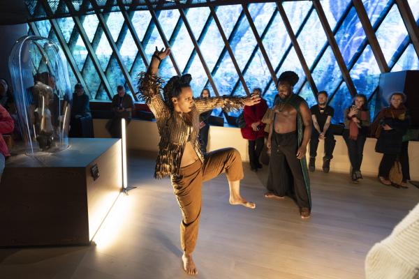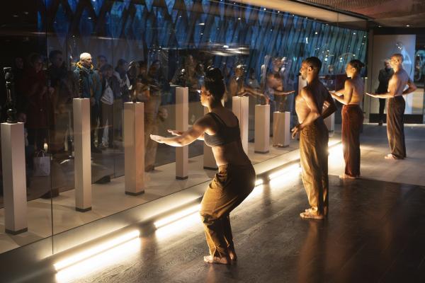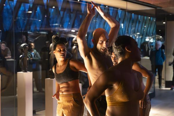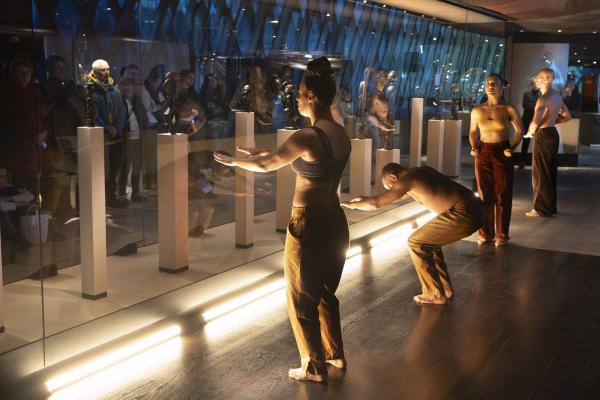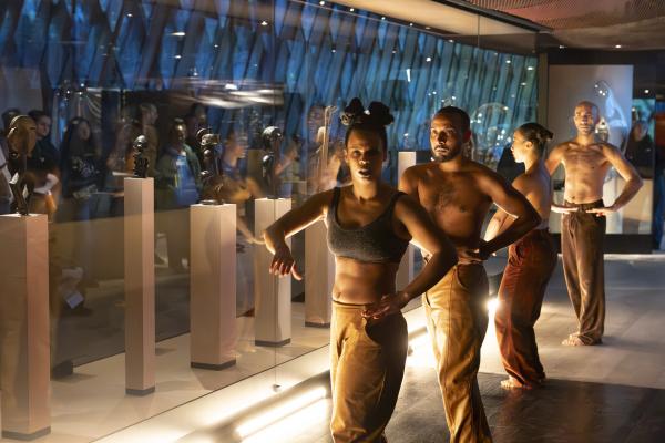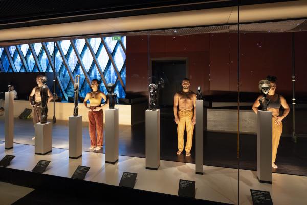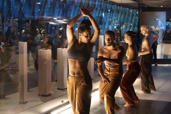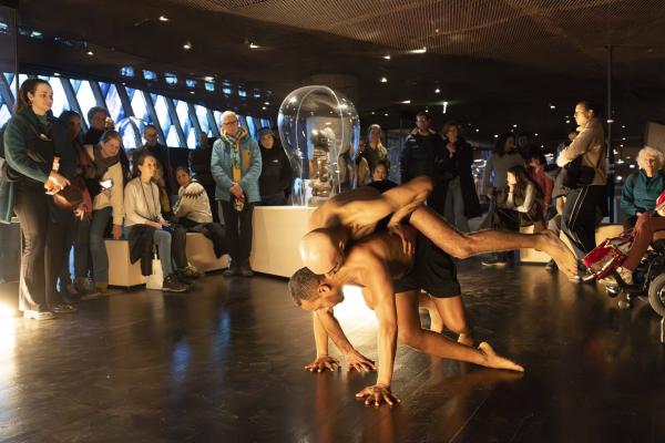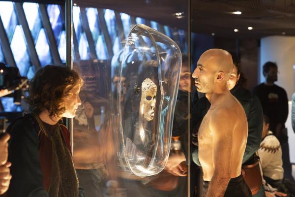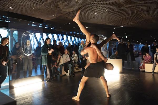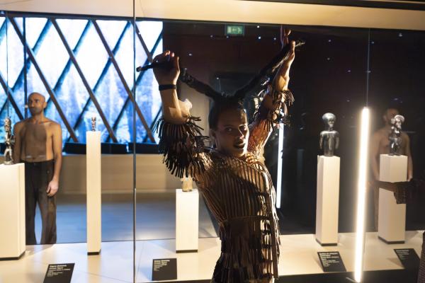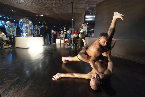 Dans la Galerie Marc Ladreit de Lacharrière, on se promène entre les œuvres, couvertes de cloches de verre aux formes plastiques sur mesure, créant des écrins aussi transparents que mystérieux, telles des capsules qui auraient transporté les œuvres à travers le temps et l’espace. Les danseurs se meuvent alors entre les colonnes, et leur propre ascendance à une dimension mystique tend la main aux réminiscences d’autres mondes. Mohamed Chniti et Mohamed Fouad se frottent l’un à l’autre comme au chant en swahili – et même au corps généreux – du contre-ténor Serge Kakudji. Ils se bousculent, se portent ou se repoussent, s’offrant appui et contre-poids dans une présence ancestrale qui, sous l’influence de la statuaire africaine, relie l’humain aux cosmogonies.