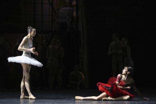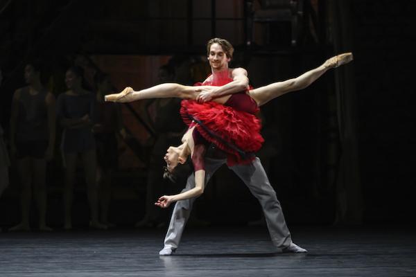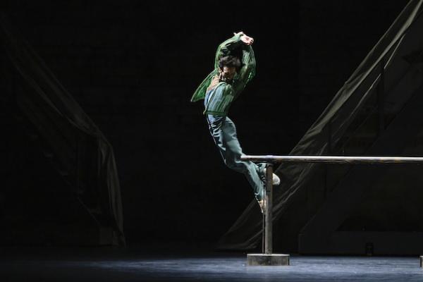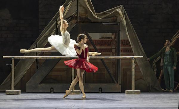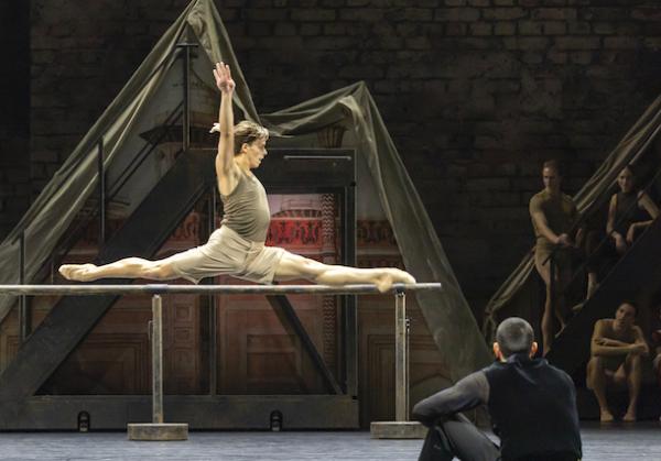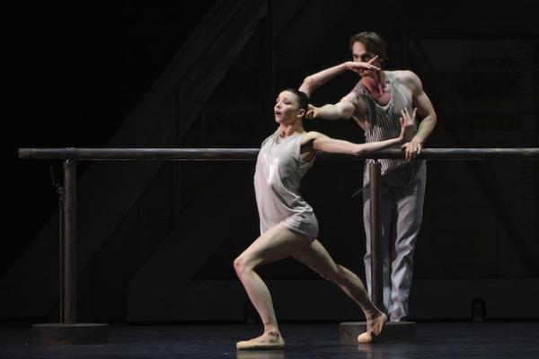 Tout débute par un échauffement avant une répétition : décor sobre de briques grises, châssis recouverts d’une bâche et artistes chorégraphique en tenue de travail. On amène des portants chargés de costumes, une barre… le drame peut commencer. Car au fond, ces grands ballets du répertoire classique ont des accents shakespeariens et s’appuient sur des sentiments universels, l’amour, la jalousie, les rivalités, le pouvoir… Et comme une troupe de danse est d’abord un microcosme de l’humanité, voici tous ces affects réunis dans un précipité explosif. D’où l’idée de faire de Ma Bayadère – inspiré donc de La Bayadère de Marius Petipa (1877) – une sorte de condensé unanime de la vie d’une compagnie. Un thème qui hante Jean-Christophe Maillot depuis longtemps ( comme dans ce Casse-Noisette Compagnie, créé en 2013, [lire notre critique] et qui, généralement, comporte une dimension autobiographique. Ma Bayadère, avec de surcroît son article possessif, n’échappe pas à la règle et développe donc, dans son récit, une portée théâtrale revendiquée par le chorégraphe et un sens de la narration chorégraphique dans laquelle il excelle. L’histoire peut donc se résumer à : deux danseuses se disputent à la fois le titre d’étoile et le même homme qui n’arrive pas à faire un choix, le tout entraînant un terrible accident, qui ruine la création du ballet. Maillot noue si habilement les deux plans, incorporant – au double sens du terme ! – des pas du ballet d’origine à sa propre écriture chorégraphique qu’il brouille les frontières entre la danse et la vie, ou entre rôle et identité, dans une illusion théâtrale parfaite. Les fragments de la version originelle s’insèrent dans son écriture comme des éclats de mémoire. Mais pour lui, comment séparer les deux ? Et si, dans l’œuvre de Petipa, la bayadère est une danseuse sacrée – sorte de Vestale dans la cosmogonie Hindoue – ici le feu sacré est caractérisé par la barre, cet accessoire indispensable de l’ascèse des danseurs.