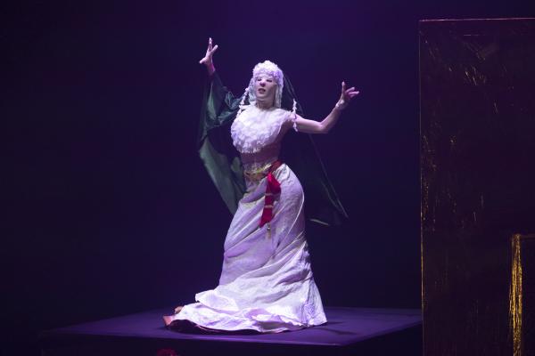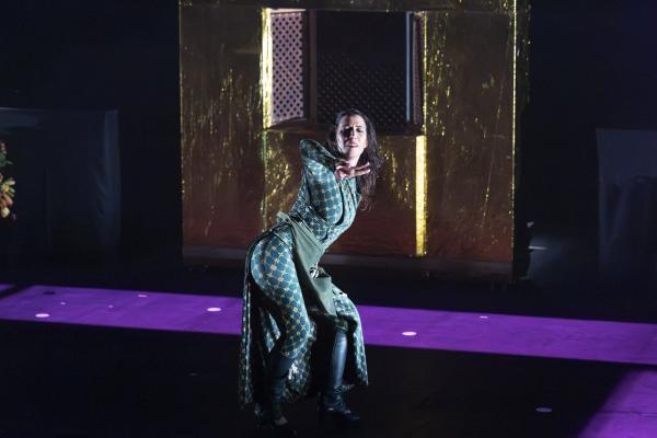 Matarife y Paraíso déploie un imaginaire flamboyant, entre Dante, Séville et les rites archaïques. Le spectacle puise dans deux sources majeures : La Divine Comédie, la Semaine Sainte de Séville. Mais loin d’en faire un collage, Marín les fond dans une dramaturgie instinctive, presque hallucinée. Les images se succèdent comme des visions : un manteau violet couvert d’images pieuses, une Vierge en gaze transparente qui surgit telle une apparition, des bras en croix, un organiste derrière une grille dorée, mi-confessional, mi-moucharabieh et des cornets genre Centurions romains qui déchirent l’air . Ce sont Manuel López « armaos » de la Centurie romaine de la Macarena, et Francisco Javier Pérez, directeur musical de la Banda del Sol.