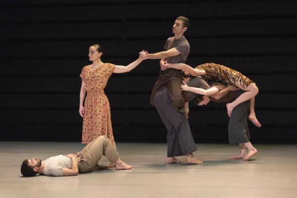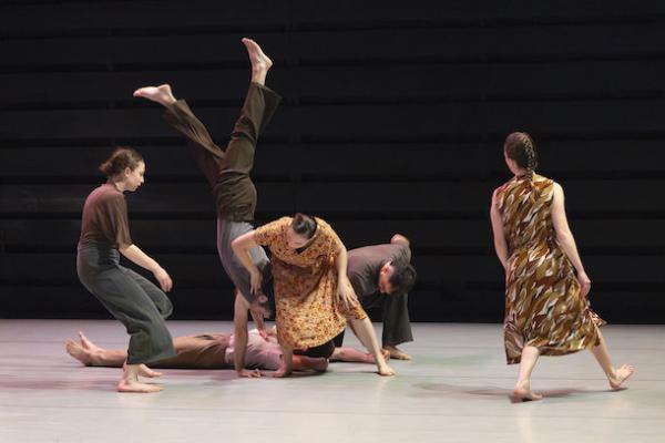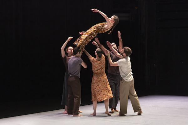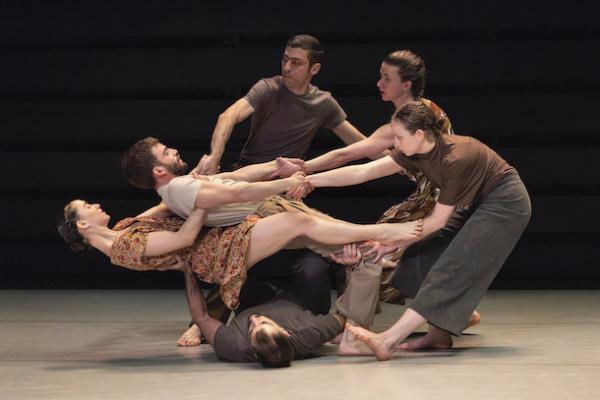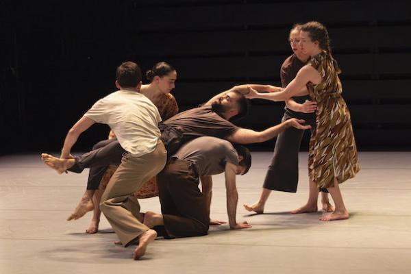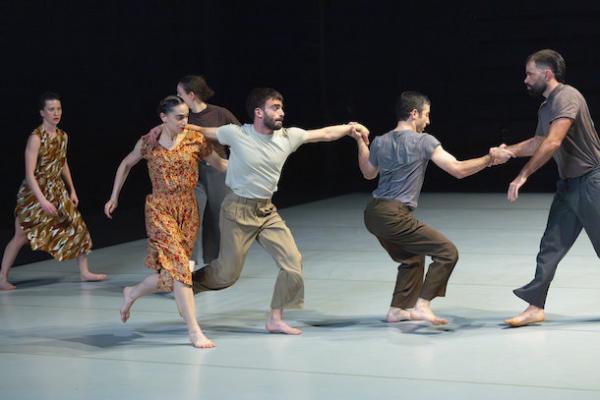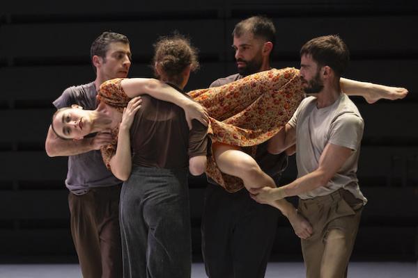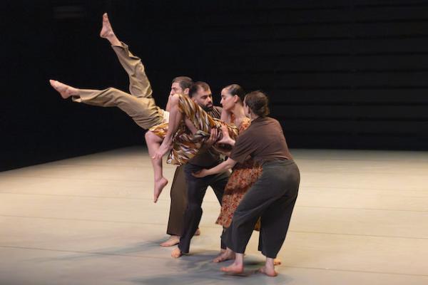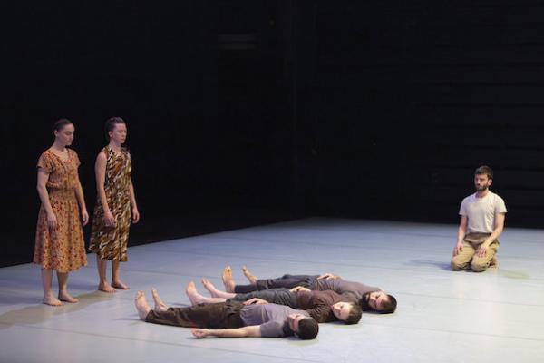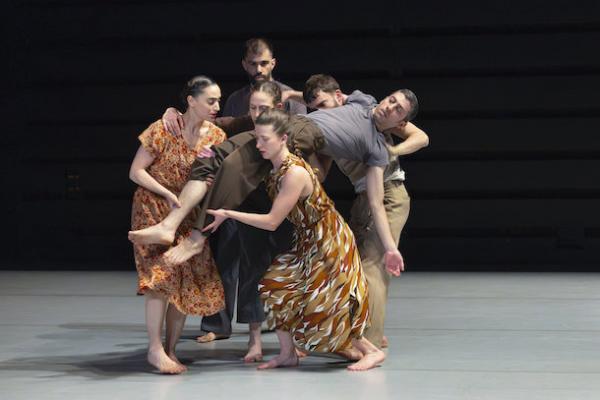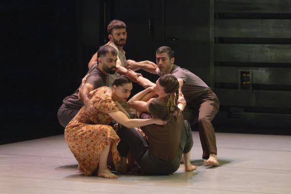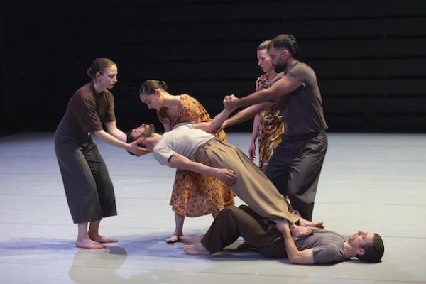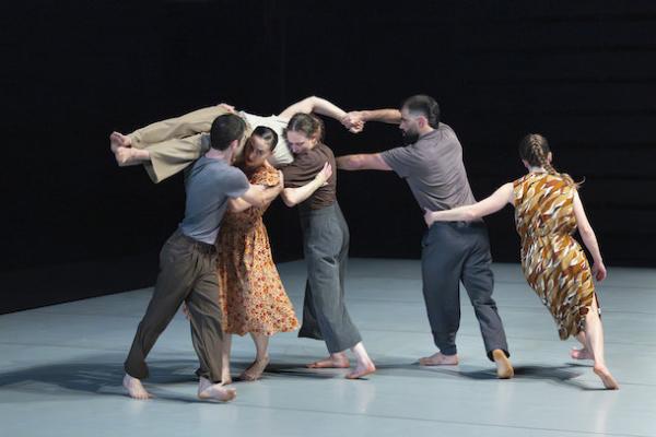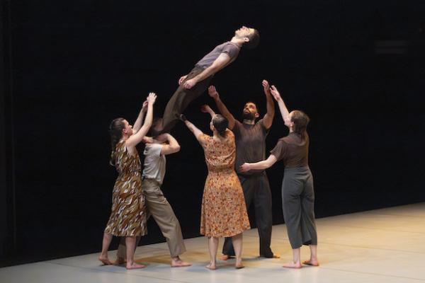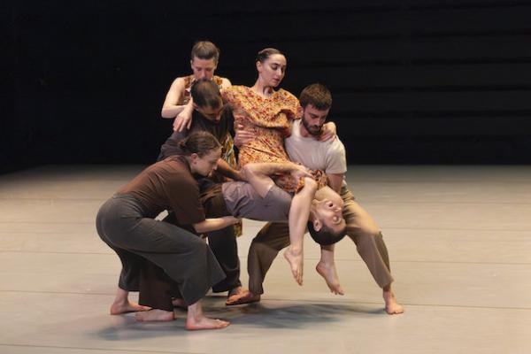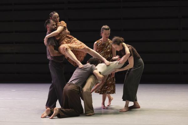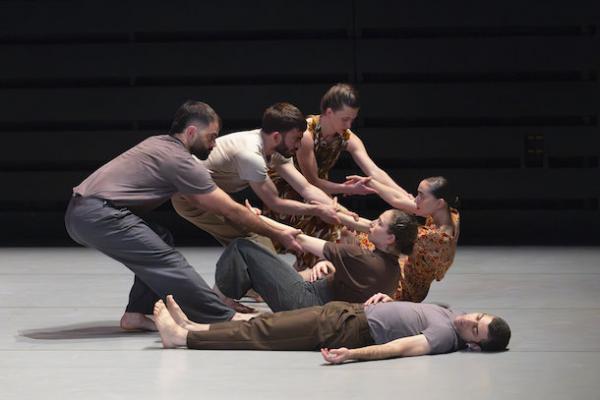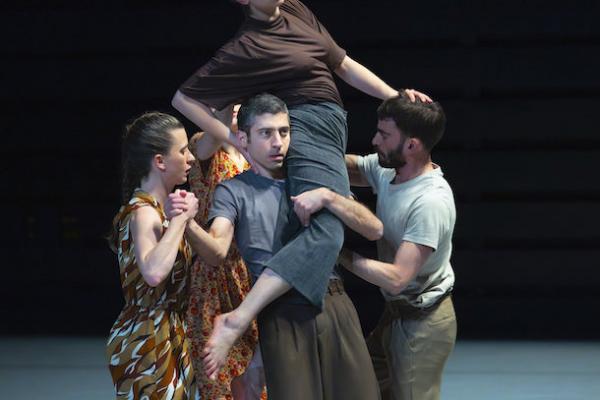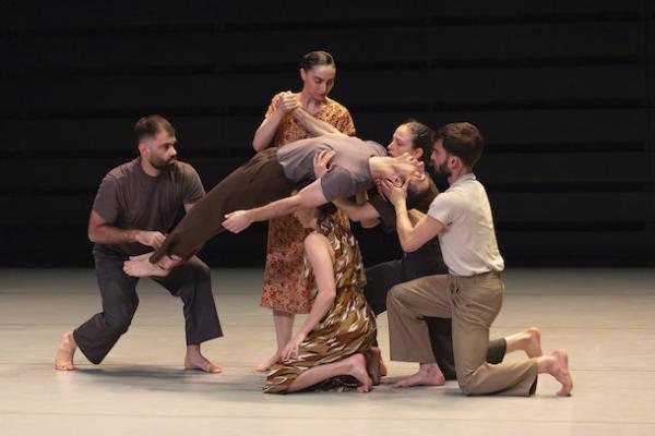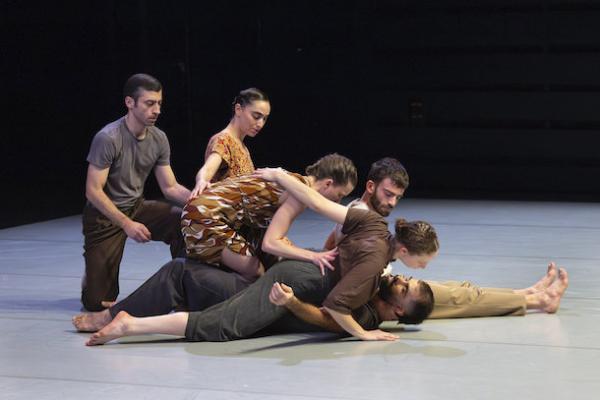 Ce travail préalable se traduit ensuite dans la confrontation avec les danseurs pour bâtir cette pièce et construire une chorégraphie. La nature d’une chute, c’est la traduction que l’on pourrait proposer pour le titre choisi par Adi Boutrous. Mais il s’agit davantage d’un mouvement perpétuel car la chute induit de se relever. Comme à l’accoutumée, le chorégraphe fait évoluer les six interprètes dont lui-même sur une scène nue, sans décor et délicatement éclairé par Ofer Laufer. On perçoit comme le son du vent et d’une tempête qui menace quand les trois danseurs et les trois danseuses pénètrent sur le plateau. Ils avancent resserrés comme amalgamés les uns aux autres. Débute une série ad libitum de figures qui vont décliner les milles et une manière de chuter : en douceur ou brutalement, en avant, en arrière, sur le côté. À chaque fois le groupe se reforme à la recherche d’un nouveau centre de gravité. Ces séquences induisent un abandon des corps et une danse qui accepte le lâcher-prise. Elle est constamment émaillée de portés acrobatiques d’une intensité remarquable et de pyramides qui exigent une confiance absolue dans ses partenaires. Adi Boutrous imagine ainsi des figures complexes sur des sons qu’il a lui-même inventés. Il y instille des séquences au sol où les danseurs rampent sur le dos. Survient sans qu’on s’y attende un arrêt sur images : les corps inertes, entassés. Immanquablement cette image puissante fait affleurer le monde réel, celui d’une région meurtrie d’où viennent le chorégraphe israélien et ses danseurs. Les images s’imposent sans qu’il soit besoin d’être démonstratif. Ainsi on perçoit plus tard dans un mouvement d’élévation collective une figure christique bouleversante.