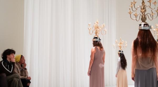 Aujourd’hui, les deux danseuses du collectif nasa4nasa, basé au Caire, Noura Seif Hassanain et Salma Abdel Salam, réinterprètent cette danse comme une installation chorégraphique vivante, portée par neuf femmes et intitulée sham3dan. Il faut dire que le cadre – une chapelle au sein de l’Abby Museum, ancienne abbaye cistercienne du XVIe siècle transformée par un coffrage blanc qui en tapisse l’intérieur – assez exceptionnel dans sa contemporanéité spirirtuelle s’y prête particulièrement. Le Shamdan y est réinvesti comme appareil central, générateur de sons, de poids et de résonances. À travers des partitions de mouvements fondées sur la répétition, la symétrie et la synchronicité, accompagnée d’un environnement sonore conçu par Ismail Hosny, les danseuses composent un paysage énergétique en perpétuelle mutation. Leurs corps, porteurs d’une mémoire fictionnelle et politique, convoquent les esprits et les récits qui ont dansé avant elles, mêlant une retenue des corps à un souvenir de danse du ventre ébauchée par l’une des danseuses, entrelaçant le sacré et le maudit à ces chandeliers dorés qui se balancent doucement sur leurs têtes.