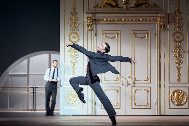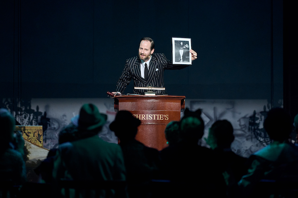 Kirill Serebrennikov qui signe le livret construit le ballet sur un flashback, qui nous cueille dès le lever de rideau, sur une vente aux enchères des objets de Noureev : tableaux de maitres, tapis persans, vaisselle de luxe. Ce parti-pris permet instantanément de situer Noureev, tout premier danseur classique superstar que le monde s’arrache et qui deviendra richissime (sa fortune était estimée à 30 millions de dollars !). Le commissaire-priseur annonce un à un les lots venus de ses différents domiciles dans un décor d’une grande habileté projetant sur les murs du plateau les reproductions géantes des trésors de Noureev. Avec ses grandes fenêtres en forme d’arche, Kirill Serebrennikov qui est aussi scénographe du spectacle, dessine un studio de danse qui se transformera au fil des tableaux.