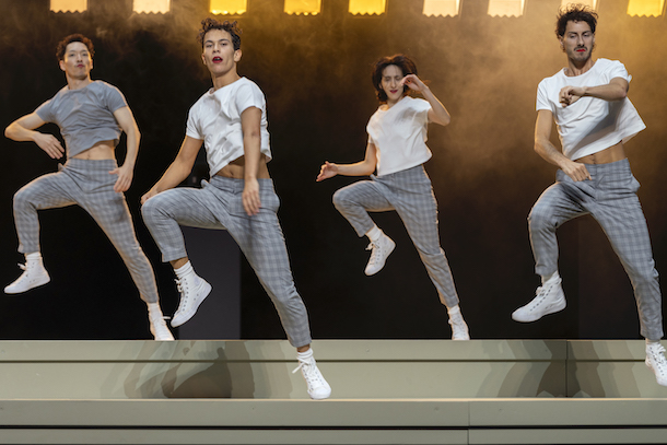 La danse relève de ce qu’il est convenu d’appeler le jumpstyle, une tendance aux origines belges, comme les deux pièces précédentes. Ce courant a inspiré (La)Horde à ses débuts, à l’époque de To Da Bone (2017), peut-être même un peu avant. Ces mouvements bissés ad lib, exécutés prestissimo font penser aux exercices de cardio training, à la zumba, au Workout jadis pratiqué par Jane Fonda et à la Gym Tonic de Véronique et Davina. Une danseuse mène la danse dans un long solo inaugural qui rappelle la course sur place, une heure durant, d’Almudena Maldonado dans Last Work d’Ohad Naharin [lire notre critique] . La techno hardcore composée par Katerina Andreou et Éric Yvelin rythme l’écoulement et motive, s’il le fallait, les douze membres du corps de ballet. Le résultat est on ne peut plus convaincant.