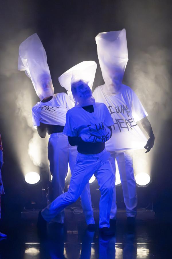 À tour de rôle, Lionel Hoche, Daniel Larrieu et Carlotta Sagna portent au dos de leur vêtement le nom de l’un de leurs camarades. Sur leur t-shirt blanc est inscrit « I was here », une phrase laconique de la plasticienne Nordine Sajot empruntée, il est des chances, à la chanteuse Beyoncé tout en insistant sur l’aller-retour entre l’ici et l’autrefois, le sujet même de la pièce ouvrÂges.