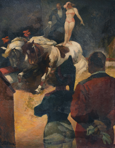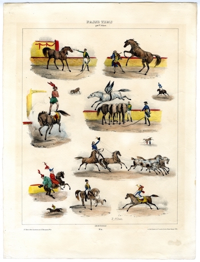 Parmi les œuvres exposées à Châlons, certaines nous touchent particulièrement : l’estampe de Zalder sur le Cirque olympique de Vienne au début du XIXe siècle, le bois-gravé publicitaire du Cirque royal de France de Victor Franconi en 1840, l’estampe de Debucourt, d’après Carle Vernet, montrant Mme Franconi dans un exercice debout en équilibre sur une jambe à dos de cheval à l’Enclos des Capucines en 1802, la gravure de William Walker présentant Thomas Johnson debout sur un, deux et trois chevaux lancés à grande allure en 1758, celle de Nussbiegel portraiturant le cavalier Jacob Bates en 1766, la magnifique composition d’un hussard de la Garde peinte par Géricault en 1812, la lithographie d’une ballerine équestre du cirque Renz dessinée vers 1855, l’affiche de 1951 d’Antonin Magne pour l’Hippodrome Pinder, la lithographie en couleurs signée Robert Wilkinson en 1815 présentant l’intérieur de l’amphithéâtre d’Astley sur Surrey Road. Et ce n’est là qu’une partie de ce qu’offre l’historique monstration.