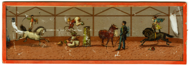 Notre plongée dans l’histoire du cirque moderne commence dans un espace en arc de cercle, une amorce de piste de cirque dont le diamètre fut fixé à 42 pieds, soit environ 13 mètres, en 1768, par l’écuyer et entrepreneur de spectacle équestre anglais Philip Astley (1742-1814), dans sa Riding school de Lambeth Marsh, près de Londres. Nous sommes guidés dans notre visite par Marika Maymard, chercheuse, autrice et collectionneuse, co-commissaire de l’exposition avec Enora Gault, directrice adjointe des musées de Châlons-en-Champagne, et Pascal Jacob, auteur, directeur artistique du cirque Phenix et collectionneur.